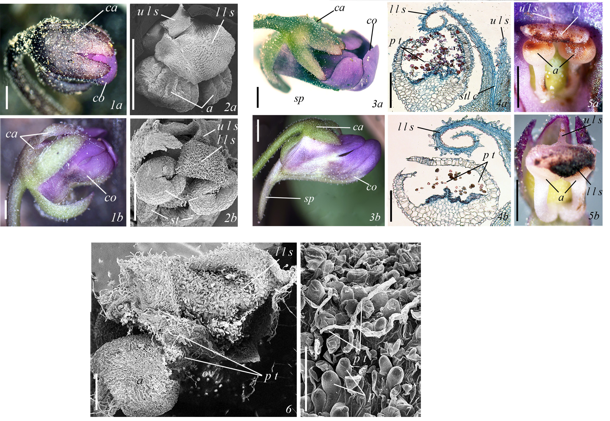 1а, b – плотный бутон, внешний вид, 2а, b – репродуктивные органы в плотном бутоне (СЭМ), 3а, b – рыхлый бутон, внешний вид, 4а, b – строение пыльника и нижней губы рыльца в рыхлом бутоне на продольном срезе (видна прорастающая пыльца в пыльниках), 5а, b – развитие восприимчивости поверхности рыльца к пыльце в рыхлом бутоне (реакция с 1%-ным раствором перманганата калия), 6, 7 – многочисленные пыльцевые трубки, врастающие в поверхность нижней губы рыльца (СЭМ, 7 – увел.); a – пыльник, са – чашечка, со – венчик, l l s – нижняя губа рыльца, р – папиллы, р t – пыльцевая трубка, sp – шпорец, st – тычиночная нить, stl c – канал столбика, u l s – верхняя губа рыльца.