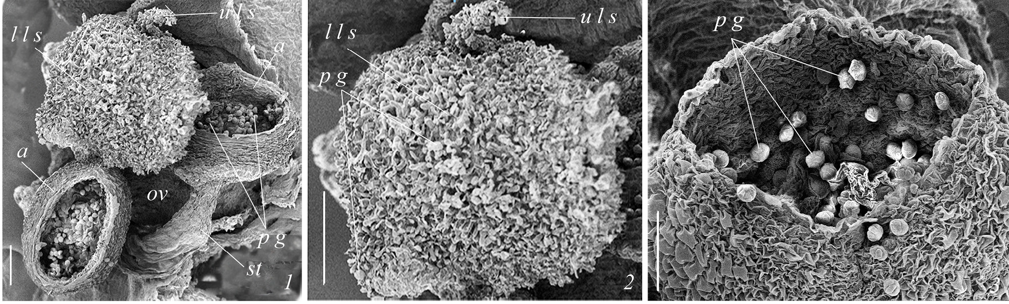 1 – внешний вид пыльников и нижней губы рыльца, 2 – поверхность нижней губы с пыльцевыми зернами (увел.), 3 – вскрывшаяся апикальная часть пыльника того же цветка, видно отсутствие прорастания пыльцевых зерен в пыльнике (СЭМ); a – пыльник, l l s – нижняя губа рыльца, ov – завязь, р g – пыльцевые зерна, st – тычиночная нить, u l s – верхняя губа рыльца.