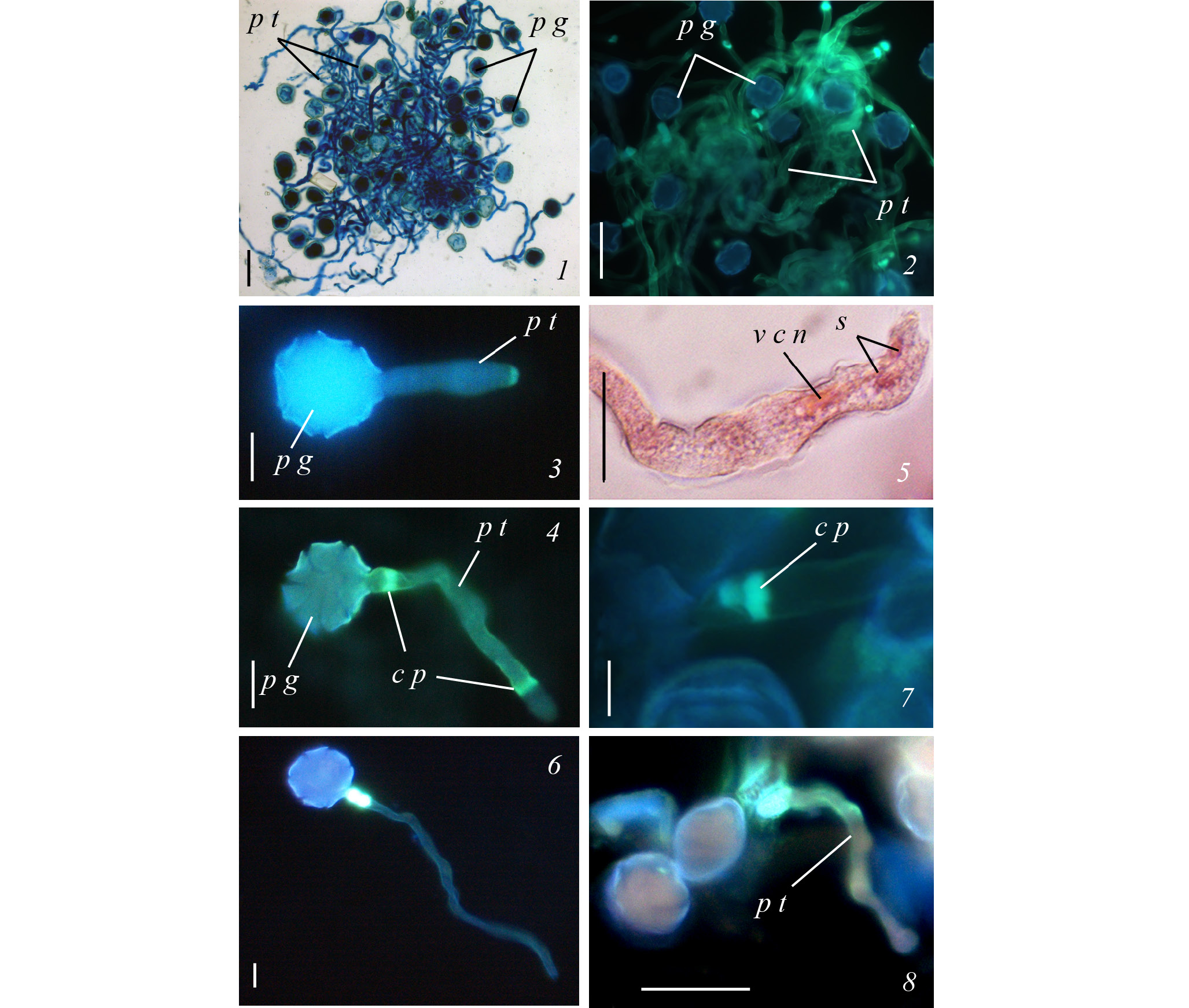 1, 2 – массовое прорастание пыльцы в пыльниках рыхлого бутона; 3–7 – растущая пыльцевая трубка с каллозными пробками и половыми элементами на апексе (7 – первая воронковидная каллозная пробка, увел.); 8 – пыльцевая трубка со вздутым кончиком; 1, 5 – окраска р-вом Шиффа и алциановым синим, 2–4, 6–8 – анилиновым синим, флуоресцентная микроскопия); c p – каллозная пробка, р g – пыльцевые зерна, р t – пыльцевая трубка, s – спермии, v c n – ядро вегетативной клетки.