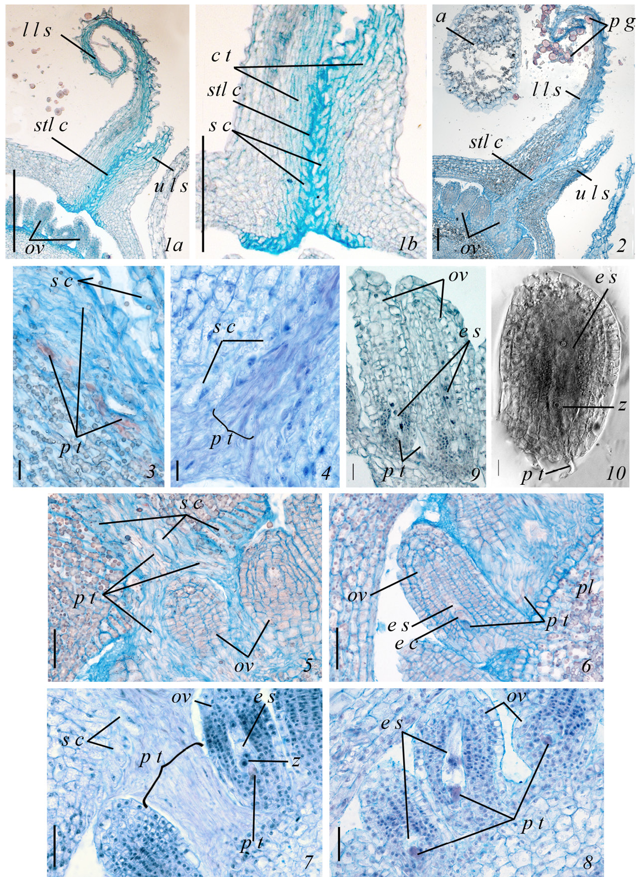 1a, b – строение рыльца и столбика до проникновения пыльцевых трубок (1а – общий вид, 1b – фрагмент столбика с проводниковой тканью увел.), 2 – рыльце и столбик после проникновения пыльцевых трубок, 3, 4 – проводниковая ткань с пыльцевыми трубками в средней (3) и нижней (4) частях столбика, 5, 6 – мощный “столб” из пыльцевых трубок на выходе канала столбика и вдоль поверхности семязачатков, 7–10 – вхождение кончиков пыльцевых трубок в зародышевый мешок почти каждого семязачатка; 1–9 – продольные срезы с окраской гематоксилином по Эрлиху, с подкраской алциановым синим, 10 – тотальный препарат семязачатка, ДИК; a – пыльник, с t – проводниковая ткань, e с – яйцеклетка, e s – зародышевый мешок, l l s – нижняя губа рыльца, o v – семязачаток, р g – пыльцевые зерна, р t – пыльцевая трубка, s с – стигматоидные клетки, stl c – канал столбика, u l s – верхняя губа рыльца, z – зигота.
