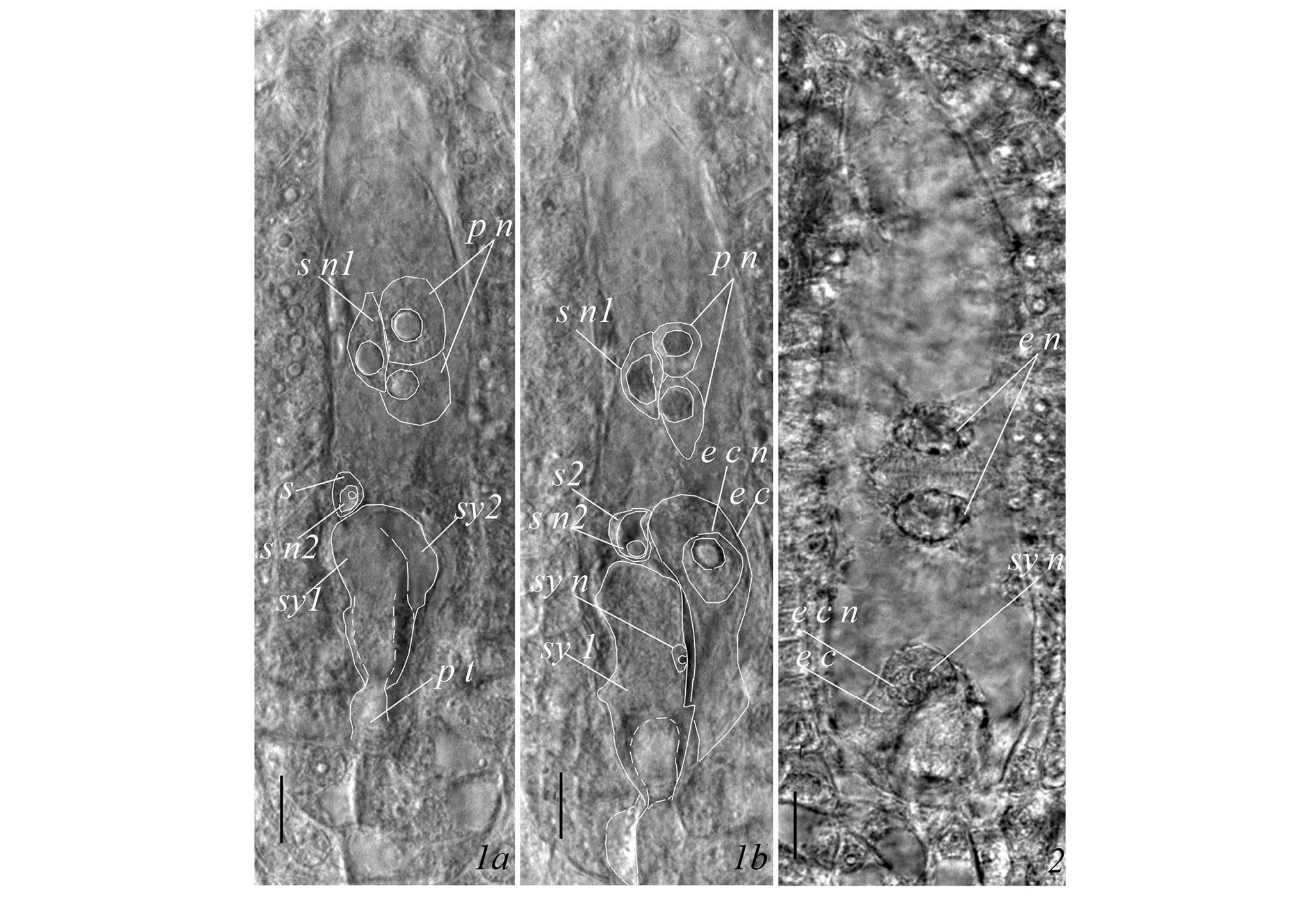 1а, b – one of the sperms near the egg cell, the second one is already fused with the central cell, with its nucleus in contact with the polar nuclei, the synergide with penetrating pollen tube is hypertrophied (sequential focusing); 2 – division of the endosperm primary cell (telophase) during the junction of sperm and egg cell nuclei; e c – egg cell, e c n – nucleus of egg cell, e n – dividing nucleus of the endosperm primary cell, s, s2 – sperms, s n1, s n2 – nuclei of sperms, sy1, sy2 – synergids, sy n – synergide nucleus, p n – polar nucleus, p t – pollen tube.