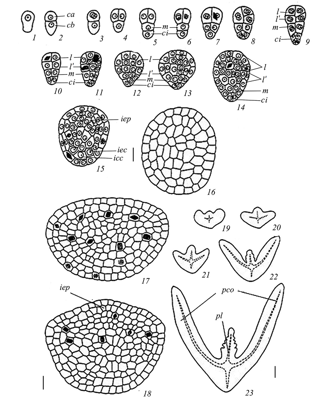 1–17 — начальные стадии эмбриогенеза и строение зародыша перед органогенезом; 18–23 — органогенез: образование семядолей и преобразование эпикотиля в почечку зародыша. са — апикальная клетка, сb — базальная клетка, сi — нижняя клетка, icс — инициали центрального цилиндра, iec — инициали коры корня, ieр — инициали эпикотиля, l, l' — верхние и нижние квадранты, m — средняя клетка, pсo — семядоля, pl — почечка зародыша. Масштабная линейка, мкм: 1–18 – 20; 19–23 – 100.