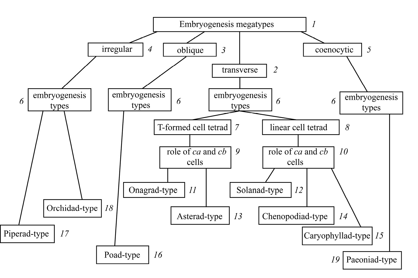 1 — мегатипы эмбриогенеза: 2 — поперечный, 3 — наклонный, 4 — иррегулярный, 5 — ценоцитный, 6 — типы эмбрионеза, 7 — Т-образная тетрада клеток, 8 — линейная тетрада клеток, 9, 10 — вклад клеток ca и сb в построении зародыша, 11, 12 — преимущественно клетка ca — Onagrad-тип (11), Solanad-тип (12), 13, 14 — обе клетки — Asterad-тип (13), Chenopodiad-тип (14), 15 — клетка сb не делится, Caryophyllad-тип, 16 — преимущественно наклонные деления клеток — Poad-тип, 17, 18 — иррегулярный тип: сочетание продольных, наклонных и поперечных перегородок (Piperad-тип — 17), разнообразие форм тетрад клеток проэмбрио и отсутствие регулярности в делении и судьбе производных базальной клетки (Orchidad-тип — 18), 19 — нуклеарные деления в проэмбрио — Paeoniad-тип. са — апикальная клетка, сb — базальная клетка.