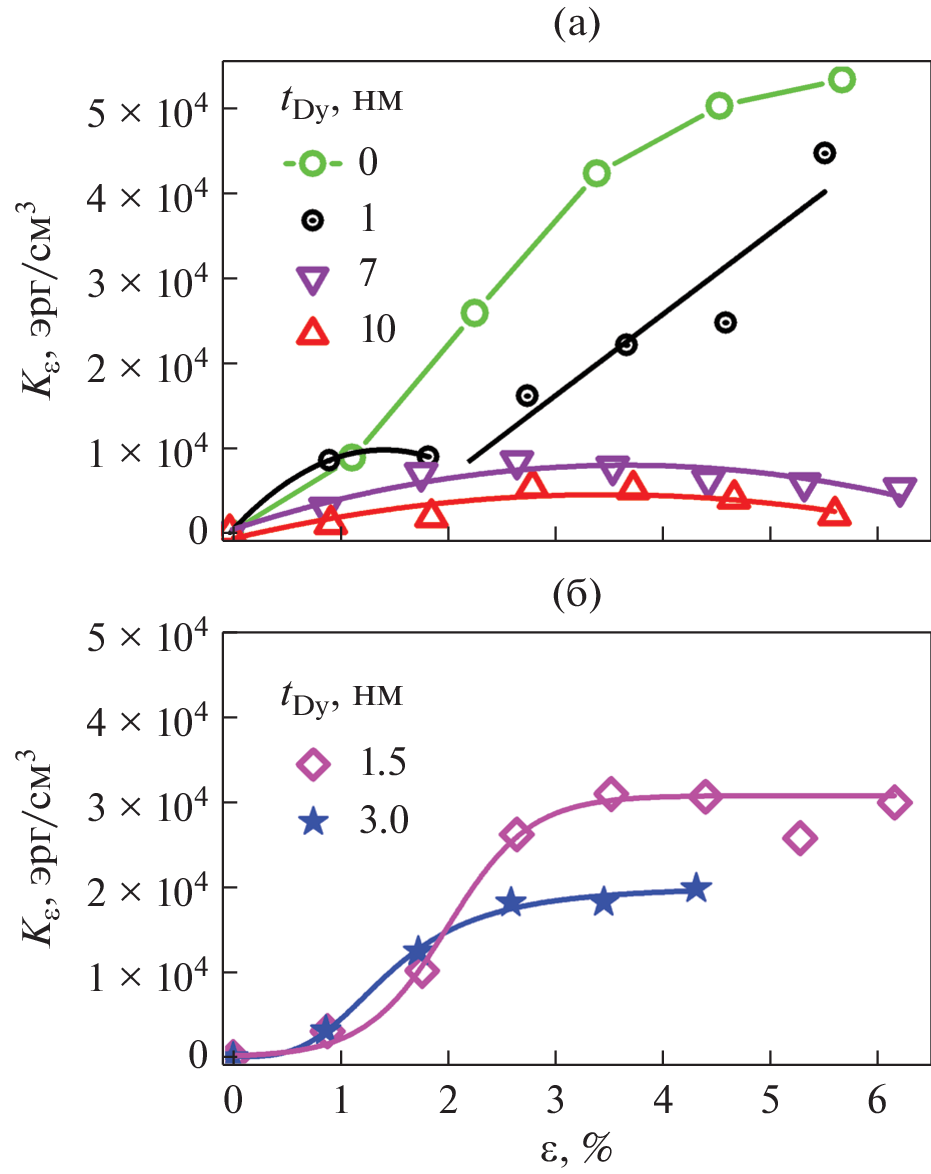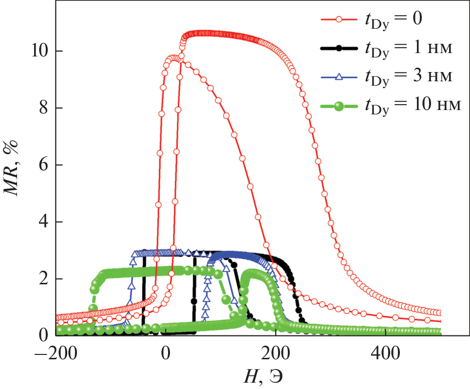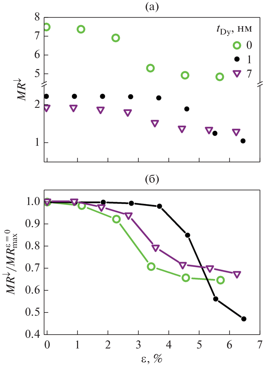 subjected to tensile deformation is shown to depend on the thickness of the dysprosium layer. In particular, the thickness of the dysprosium layer affects the maximum relative elongation at which the magnetoresistance