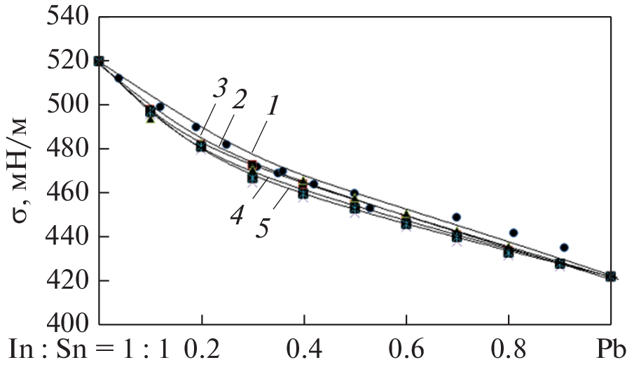 A comparative analysis of semi-empirical methods based on the Kohler, Bonnier, and Toop models for predicting the surface tension (ST) of ternary systems has been performed. Surface tension–concentration dependence calculations have been carried out in the indium–tin–lead and indium–tin–gallium systems. The ternary indium–tin–lead system is characterized by the fact that the excess surface tension isotherms of all the side binary melts are symmetrically shaped with respect to the equimolar composition, and such systems are called symmetric. In the ternary indium–tin–gallium system, the excessive surface tension isotherms of side binary indium–gallium and tin–gallium systems have pronounced asymmetry with respect
