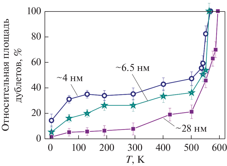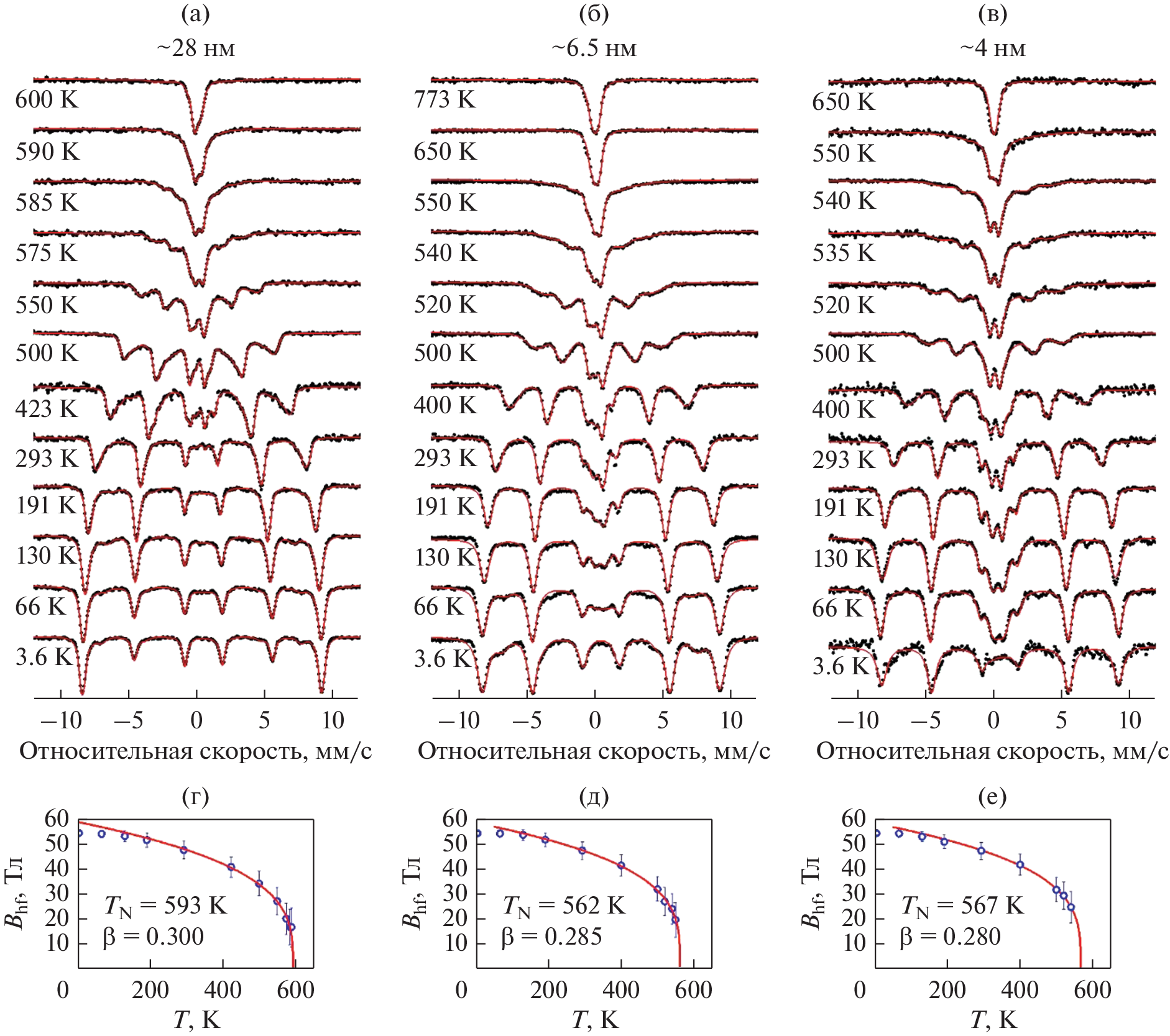Исследованы магнитные свойства ультратонких монокристаллических пленок ортоферрита Y57FeO3 методом мессбауэровской рефлектометрии. Измерения мёссбауэровских спектров проведены на синхротроне ESRF в геометрии отражения. При изменении температуры от 3.6 до ~773 К расщепление зеемановского секстета в спектрах последовательно уменьшается и одновременно в них появляется квадрупольный дублет, свидетельствующий о развитии магнитного фазового перехода. По температурным зависимостям магнитного сверхтонкого поля Bhf для основной орторомбической фазы Y57FeO3 определены значения температуры Нееля TN ≅ 593, 562 и 567 К и критического параметра β ≅ (0.28–0.3) ± 0.02 в пленках толщиной 28, 6.5 и 4 нм соответственно. Анализ изменения соотношения интенсивностей линий в зеемановском секстете с температурой позволяет проследить за последовательным разворотом направления антиферромагнитных осей в Y57FeO3 к плоскости поверхности при увеличении температуры, а также уменьшении толщины пленки.