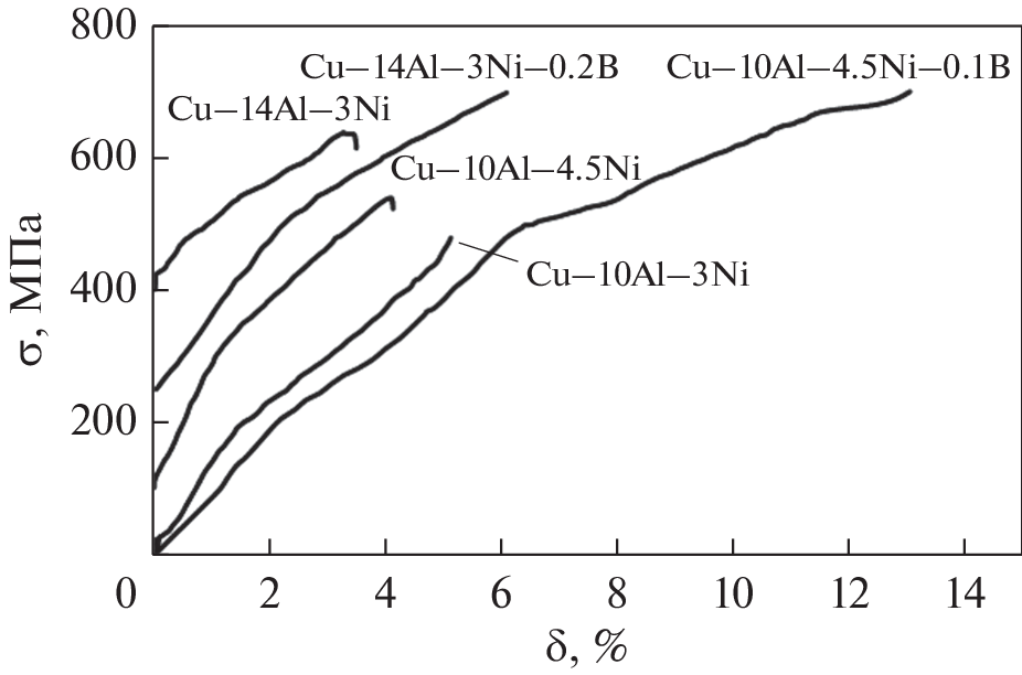 For the first time, data on the peculiarities of the structure of the Cu–Al–Ni–(B) alloys differing in the contents of alloying elements, namely, containing 10–14 wt % aluminum, 3, 4, 4.5 wt % nickel, and 0.02–0.3 wt % boron were obtained using optical, scanning, and transmission microscopy and X-ray diffraction analysis along with measurements of tensile mechanical properties. The effect of boron on the grain size, structure, phase composition, and mechanical properties of the shape-memory alloys has been studied. The localization of aluminum boride precipitates in the structure has been studied, and the effect of grain growth