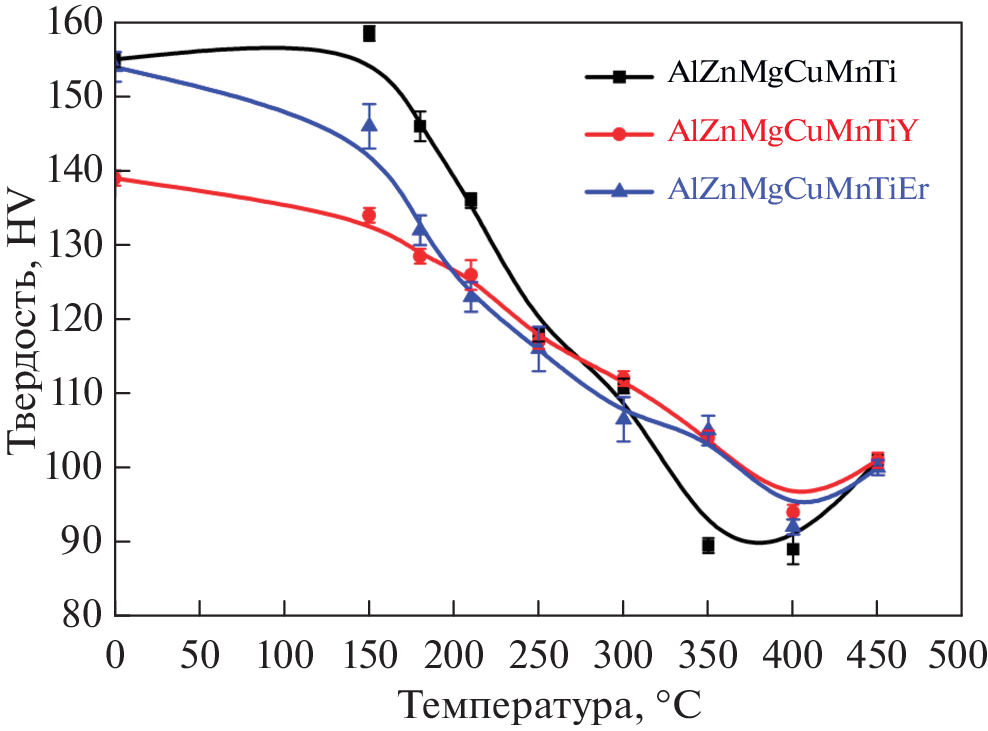 The structure and properties of rolled Zn-Mg-Cu-Zr-Y(Er) alloys alloyed with manganese and modified with titanium have been studied. According to the results of tensile tests in the deformed and annealed state at 120-150°C for one hour, AlZnMgCuMnTi and AlZnMgCuMnTiEr alloys have a high yield strength of 417-456 MPa with a small relative elongation of 2-5.2%. The presence of additional dispersant-forming elements of yttrium and erbium increases the particle precipitation density during homogenization annealing, increasing the temperature of the onset of recrystallization and the hardness of the rolled alloys. After one hour annealing at 350°С, the structure of the AlZnMgCuMnTi alloy is completely recrystallized, while recrystallization is just beginning in alloys with yttrium and erbium. After quenching from 465°C and aging at 120°C, the test alloys have a yield strength of more than 410 MPa, a tensile strength of more than 520 MPa, and an elongation of more than 10%. The obtained properties are higher than the properties of clad sheets of high-strength heat-strengthened alloy Al-Zn-Mg-Cu (B95A) and bars of AlZn4.5Mg1.5Mn and AlZnMg1.5Mn alloys and are at the level of properties of bars of Al-Zn-Mg-Cu alloy (B95).