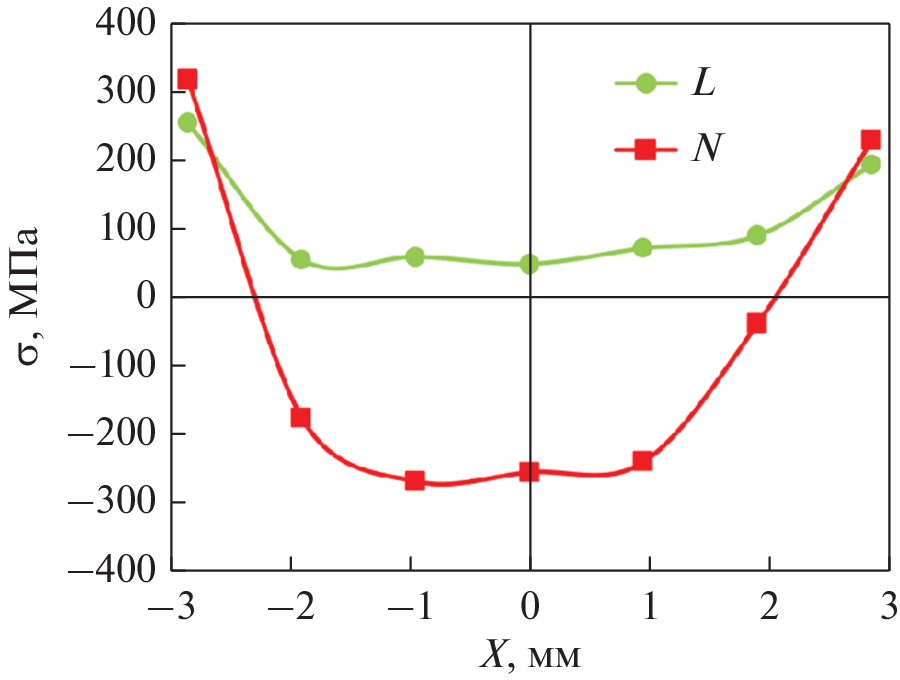 Методом дифракции нейтронов проведено исследование остаточных напряжений в пластинах из коррозионностойкой мартенситной стали AISI 410 (в мас. % 0.15С, 13Cr, <1Mn, <1Si, основа Fe), полученных путем прямого лазерного выращивания. Пластины выращивались на жестких подложках, которые обычно используются на практике при производстве крупногабаритных деталей. Показано, что в пластинах разной толщины (2.4 и 7.2 мм) и одинакового размера по длине и ширине (70 × 30 мм) кривые распределения напряжений по форме имеют большое сходство, однако напряжения в пластине толщиной 7.2 мм ниже, чем в пластине толщиной 2.4 мм. В обеих пластинах (2.4/7.2 мм) максимальные растягивающие нормальные напряжения (~450/350 МПа) образуются вблизи боковых ребер у подложки. Максимальные растягивающие продольные напряжения (~400/250 МПа) образуются в средней части пластины вблизи верхнего ребра. В средней части пластины толщиной 7.2 мм имеется распределение напряжений по толщине: напряжения вблизи боковых поверхностей выше, чем в середине толщины. При приближении к ребрам пластины распределение по толщине становится более однородным. Характер распределения напряжений в пластинах, полученных методом прямого лазерного выращивания, сильно зависит от жесткости подложки и в меньшей степени от материала и технологии выращивания.