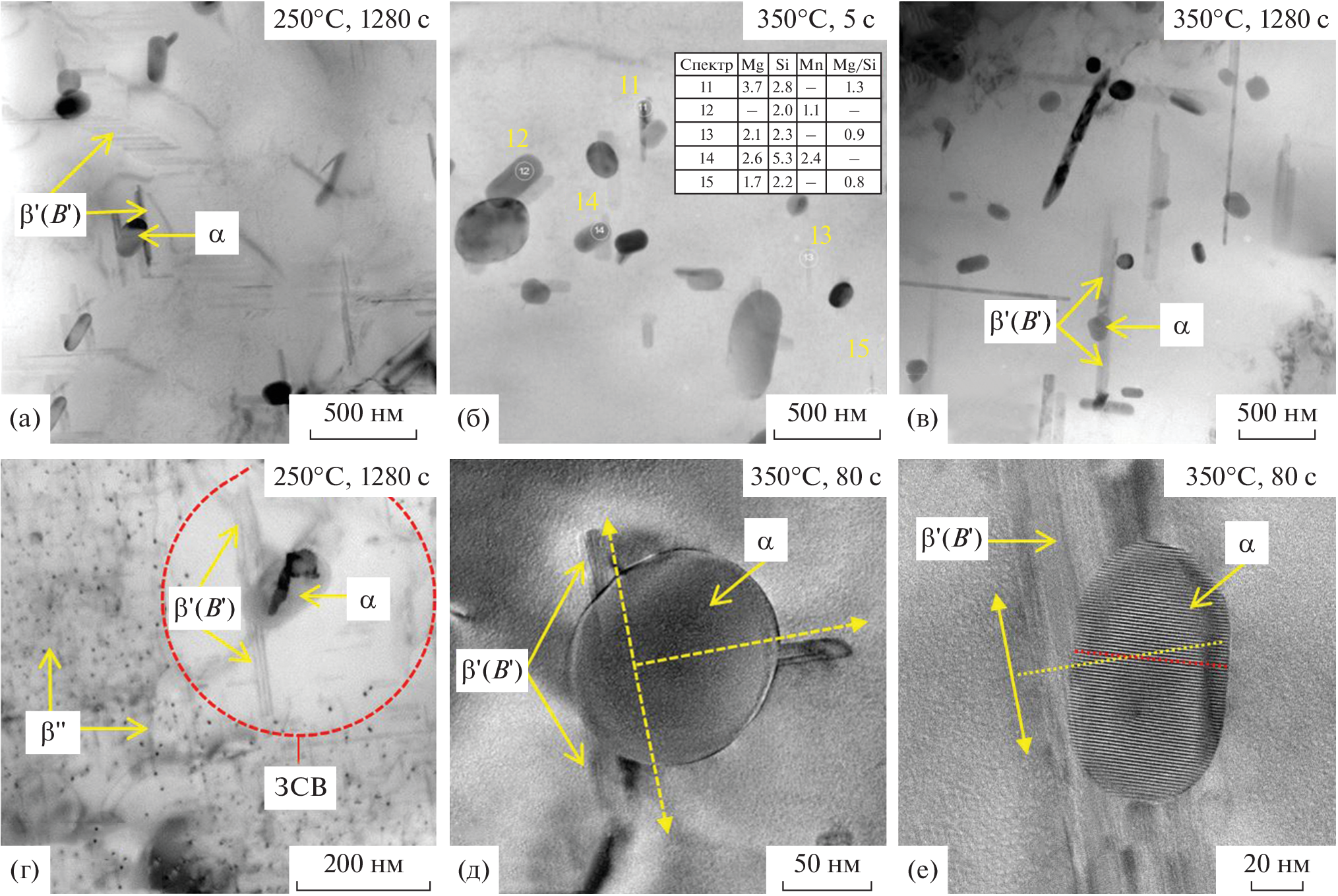This paper presents the results of a study of the stability of a supersaturated solid solution (SSS) of sheets made of thermally hardened aluminum alloy of the Al-Mg-Si system with a small addition of copper (Al-0.6Mg-1.0Si-0.2Cu) under various quenching modes. The samples were subjected to isothermal or continuous quenching with different quenching cooling rates, after which artificial aging was carried out at a temperature of 170°C. From the results of thermodynamic modeling of the equilibrium phase composition of the alloy, it was found that for the temperature range from 300 to 530°C, the presence of the β-phase (Mg2Si) is most likely. With the use of transmission electron microscopy and X-ray spectral microanalysis, it was found that during quenching, the decomposition of SSS leads to the precipitation of undesirable large particles of metastable β-type phases or equilibrium β-phase. The nucleation of the secretions is realized in the form of rod-shaped particles by a heterogeneous mechanism mainly on the surface of the α-phase dispersoids (Al15(Mn,Fe)3Si2), which thus significantly increase the quenching sensitivity of the alloy. The formation of these secretions at a low quenching rate causes, during subsequent aging, a decrease in the proportion and density of formation of strengthening particles of the β" phase, and also leads to an increase in their size and heterogeneity of distribution in the aluminum matrix, which reduces the potential of dispersion hardening during aging and corrosion resistance of the material.