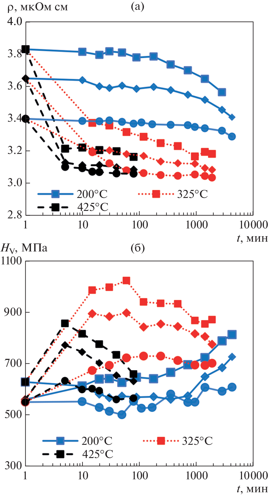 —The results of studies of the kinetics of solid solution decomposition during firing of fine-grained conductive alloys Al–0.5% Mg–Sc with different scandium content are presented. The alloys were obtained by induction casting, and the fine-grained microstructure was formed using equal-channel angular pressing. The kinetics of the decomposition of a solid solution has been studied using methods for measuring electrical resistivity and microhardness. The results were analyzed using the Johnson–Mel–Avrami–Kolmogorov equation. It is shown that during the firing of fine-grained alloys, the separation of Al3Sc particles along the nuclei of lattice dislocations is observed, and discontinuous precipitation of scandium in aluminum also occurs.