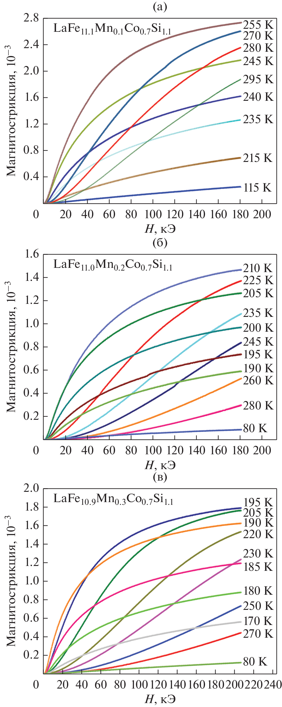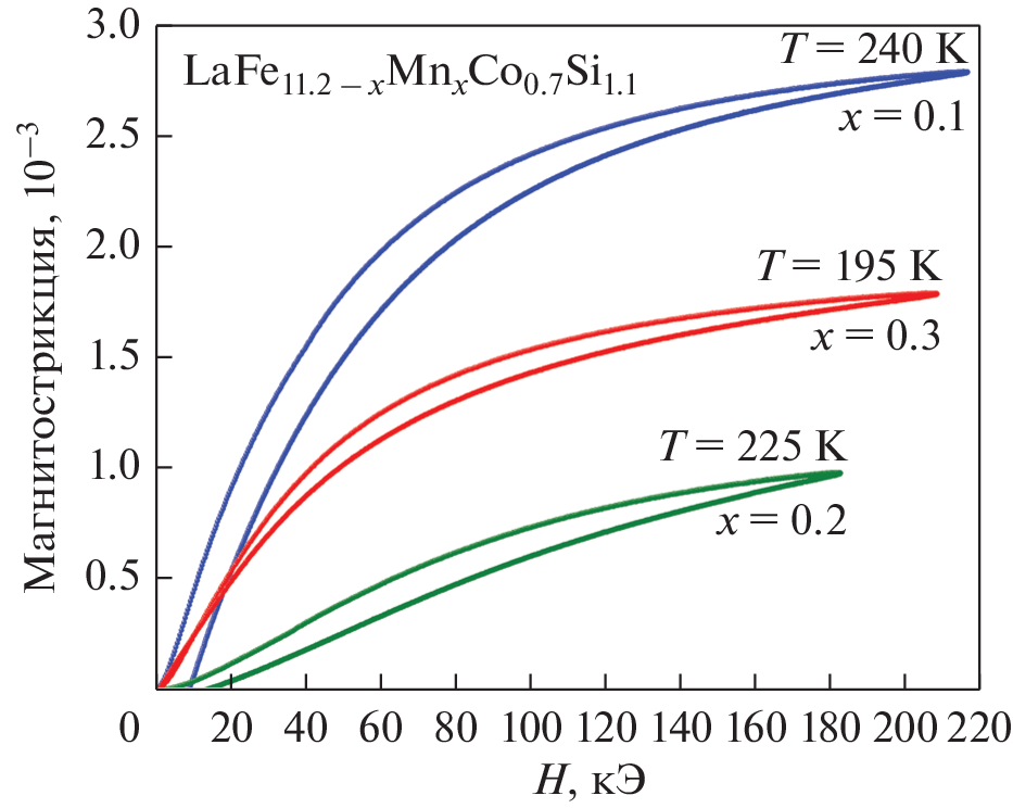 The magnetization and magnetostriction of polycrystalline alloys LaFe11.2 – хMnxCo0.7Si1.1 (x = = 0.1, 0.2, 0.3) were measured in pulsed magnetic fields up to 180 kOe in the temperature range 80–270 K. The replacement of Fe atoms by Mn atoms shifts the TC towards low temperatures and does not affect the value of saturation magnetization. The observed field dependence of the magnetization M(H) near the TC is characteristic of second-order phase transitions, while the temperature dependence of the magnetization M(T) above the TC in strong magnetic fields indicates a first-order magnetic phase transition. The magnetic volume effect ΔV/V reaches 0.81% in a field of 180 kOe. The asymmetry of magnetostriction relative to the temperature of the maximum effect, manifested in strong magnetic fields, and the magnetic field hysteresis of magnetostriction bear signs of a first-order phase transition