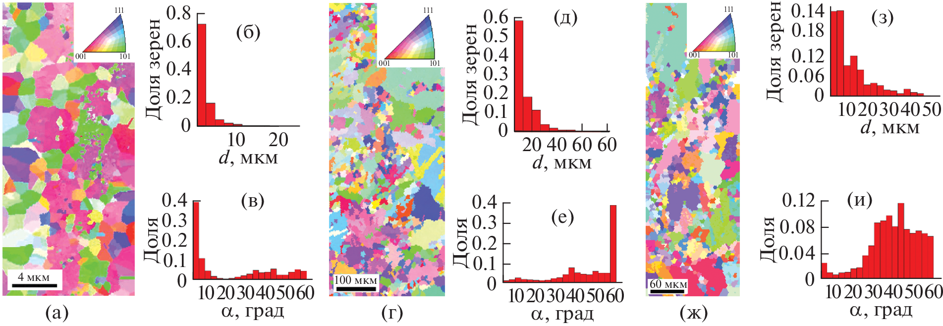 Исследованы механические свойства сплавов Cu–0.03 мас. % Zr и Cu–0.10 мас. % Cr с субмикрокристаллической структурой, сформированной при динамическом канально-угловом прессовании и последующих отжигах. Свойства сплавов изучены в условиях ударного сжатия с давлением 4.7–7.0 ГПа и скоростью деформации (1.3–3.2) × 105 с–1. Показано, что измельчение зерна от 200–400 до 0.3–1.0 мкм увеличивает динамический предел упругости и динамический предел текучести сплава Cu–0.03% Zr в 1.9 и 1.8 раза соответственно, но уменьшает в 1.4 раза откольную прочность. Последующие отжиги при 400 и 450°C позволяют увеличить характеристики упругопластического перехода соответственно в 3.0 и 3.7 раза и повысить откольную прочность до уровня крупнокристаллического аналога. Определено, что диспергирование структуры сплава Cu–0.10% Cr до 1.0–5.0 мкм увеличивает не только динамический предел упругости и динамический предел текучести в 3.7 и 2.6 раза соответственно, и откольную прочность в 1.5 раза, по сравнению с ее значением в крупнокристаллическом состоянии.