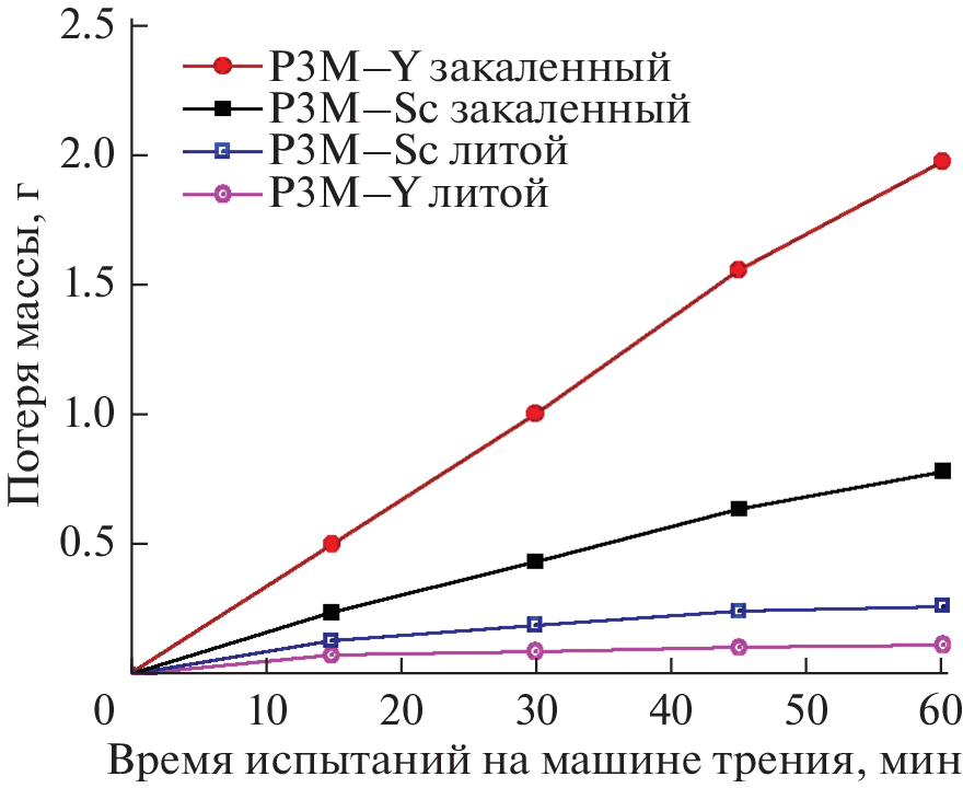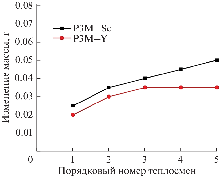 The high-entropy alloys GdTbDyHoSc and GdTbDyHoY having equiatomic composition are considered as promising materials for magnetic cold generators. The results of the alloys structure and chemical composition investigation are presented in this paper. The solidus and liquidus temperatures of the alloys under investigation were determined by the method of differential scanning calorimetry. Based on these data, an experimental mode of thermocyclic treatment was selected. There were no signs of alloys destruction after five cycles testing for heat resistance in the following regime: 15 min exposition at 1073 K (~0.6 of the melting temperature) and subsequent quenching in room temperature water. It was found that the applied heat treatment led to an increase in the hardness of the alloys by 2–3 times and a decrease in wear resistance by 4–40 times, depending on the composition of the alloys and the number of heat treatment cycles. A significant change in the properties of alloys is associated with the formation of oxides of the REM2O3 type not only on the surface of the alloys, but also in their volume, which is due to the high chemical activity of rare earth metals (REM). The presented data will be useful for the development of modes of thermal and thermomechanical processing of various alloys.