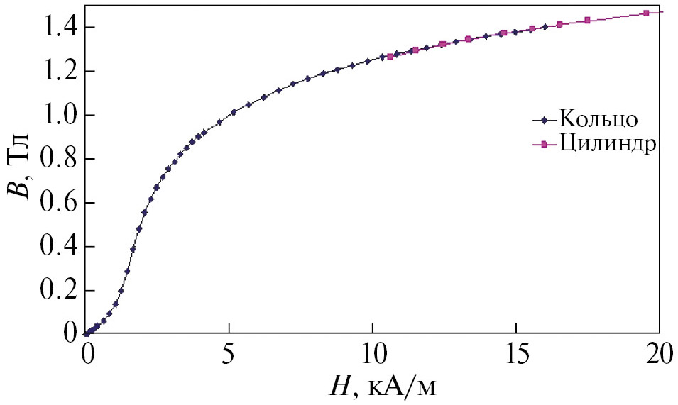 Применяемая методика измерения магнитных свойств материалов предусматривает выполнение измерений в двух перекрывающихся диапазонах величин магнитного поля, на кольцевом и цилиндрическом образцах, каждый со своей схемой измерения и диапазоном применимости. В сумме они охватывают практически весь значимый для расчетов магнитных систем диапазон полей. Перекрытие диапазонов позволяет дополнительно контролировать точность измерений по степени совпадения кривых.