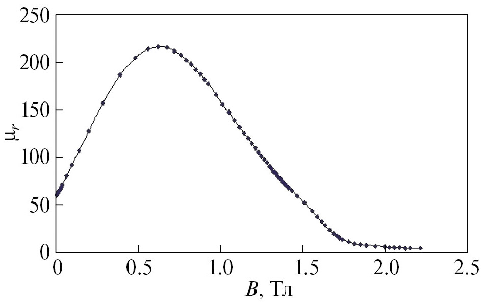 Рис. 6. Зависимость магнитной проницаемости µᵣ от магнитной индукции В.