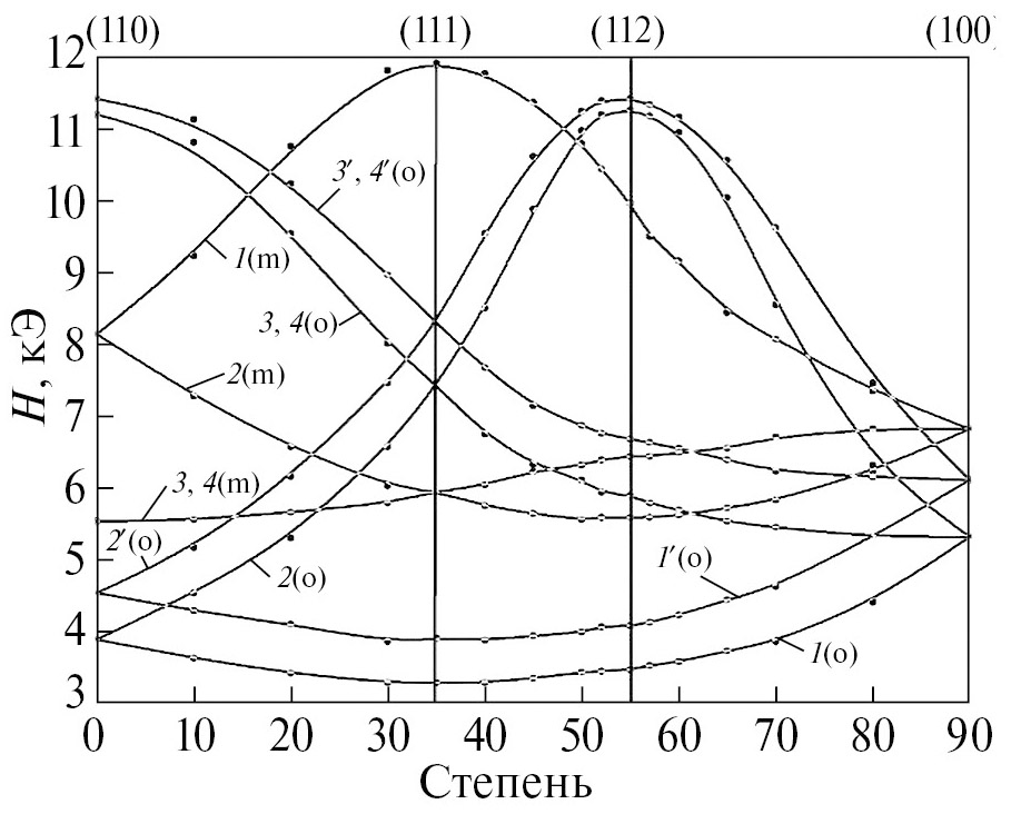 Рис. 2. Угловая зависимость положений линий спектра ЭПР для ионов Co²⁺ аксиальной симметрии в плоскости {110} при Т = 4.2К [22]. Буквами о и m рядом с цифрой на линии обозначены октаэдрические и тетраэдрические позиции Co²⁺ соответственно.
