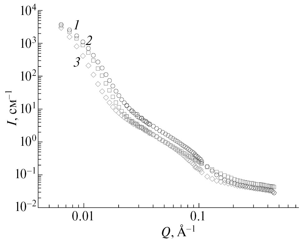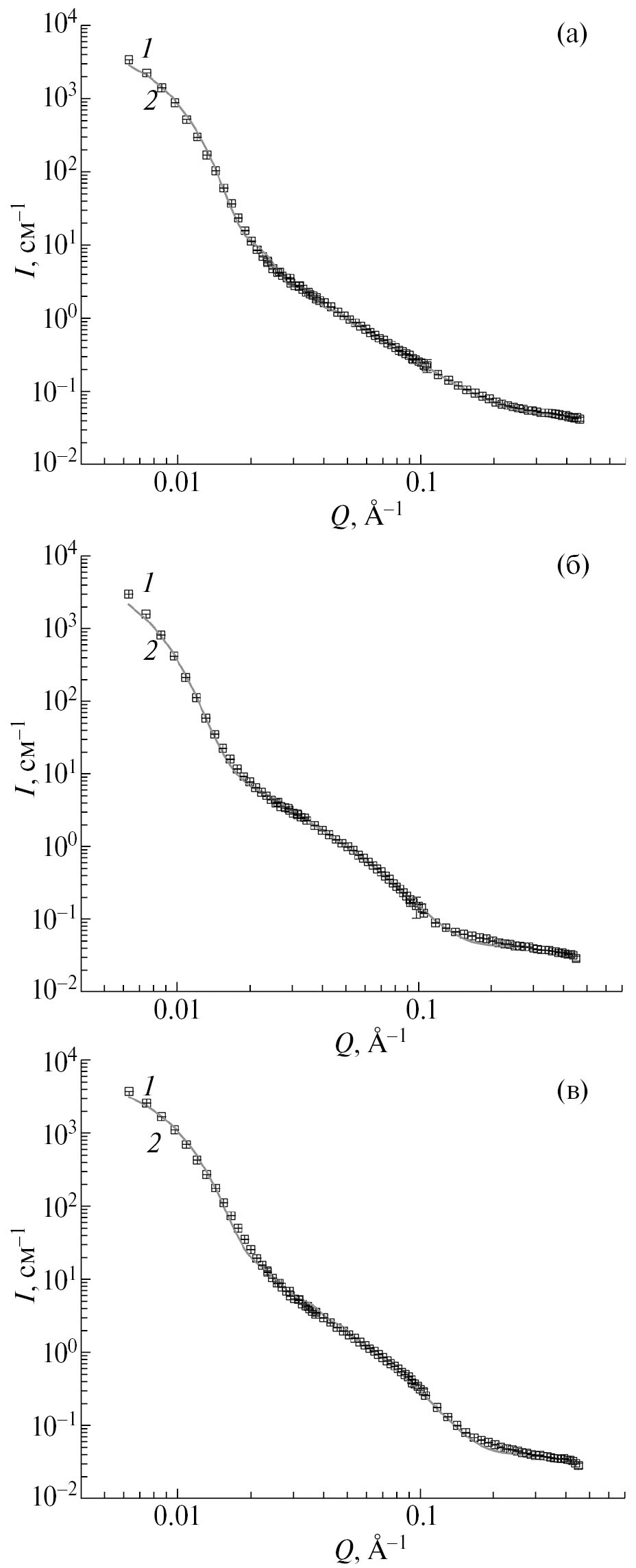 Для обработки данных использовали модель сферических включений с логнормальным распределением этих включений по размеру. Расчет параметров распределения числа включений по размерам, их средний размер и объемная плотность определены исходя из зависимости интенсивности рассеяния I от вектора рассеяния Q: