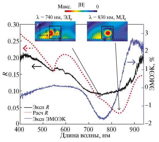 Спектры коэффициента отражения и ЭМОЭК при угле падения θ = 10° представлены на рис. 3. В спектрах отражения наблюдается минимум на длине волны 675 нм. Установлено, что возбуждается электрическая дипольная мода ЭДx, дипольный момент которой направлен вдоль оси x (см. распределение | H | на рис. 3). Данному резонансу в спектре ЭМОЭК соответствует максимум со значением 0.3 %.