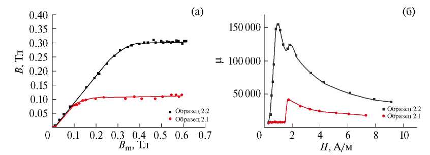 Рис. 1. Зависимости остаточной индукции от максимальной (а) и полевые зависимости магнитной проницаемости (б) образцов 2.1 и 2.2.