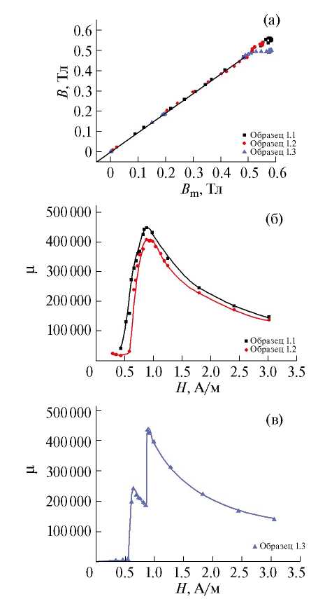 Рис. 2. Зависимости остаточной индукции от максимальной (а) и полевые зависимости магнитной проницаемости образцов 1.1, 1.2 (б) и 1.3 (в).