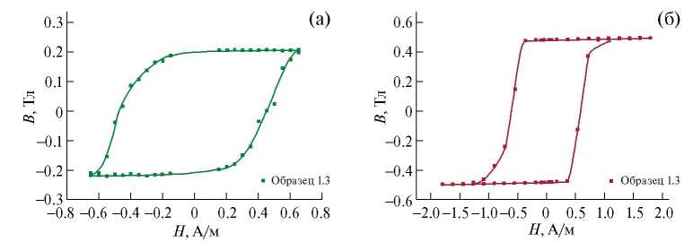 Рис. 3. Начальные участки кривых намагничивания образцов 1.1, 1.2 (а) и 1.3 (б).