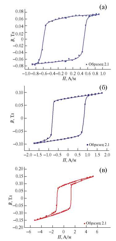 Рис. 8. Петли гистерезиса образца 2.1, измеренные в области постоянства (а), максимума (б) магнитной проницаемости и (в) смещения 90-градусных доменных границ.
