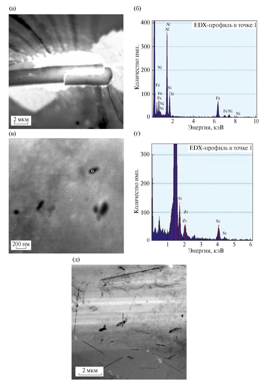 После отжига сплава AlMgSiScZr при 550 °C в течение 8 ч с помощью ПЕМ обнаружены интерметаллиды типа Al9Fe2Si2 (рис. 5а, б) [27]. Они, по всей видимости, представляют собой остатки более крупных интерметаллидов Fe2Mg7Si10Al18, из которых в ходе высокотемпературного отжига вышел магний и частично кремний. Интерметаллиды Al9Fe2Si2 наблюдаются по границам зерен в виде грубых пластин шириной более 2 мкм и длиной в десятки микрон. Также обнаружены частицы, которые по своей морфологии можно было отнести к AlSc2Si2 (рис. 5в, г). Однако наличие в них циркония указывает на фазу Al5SiZr2 [28]. Содержание в них скандия объясняется его склонностью вступать в реакцию с кремнием, а также его способностью частично растворяться (около 5 %) в алюминидах, содержащих цирконий [9]. Частицы Al5SiZr2 (или AlSc2Si2) выделяются в виде протяженных стержней длиной от 400 до 1000 нм и диаметром от 50 до 110 нм, отдельные выделения имеют длину до 2.5 мкм (рис. 5д). Спектр, полученный с протяженных частиц, близок представленному на рис. 5г.
