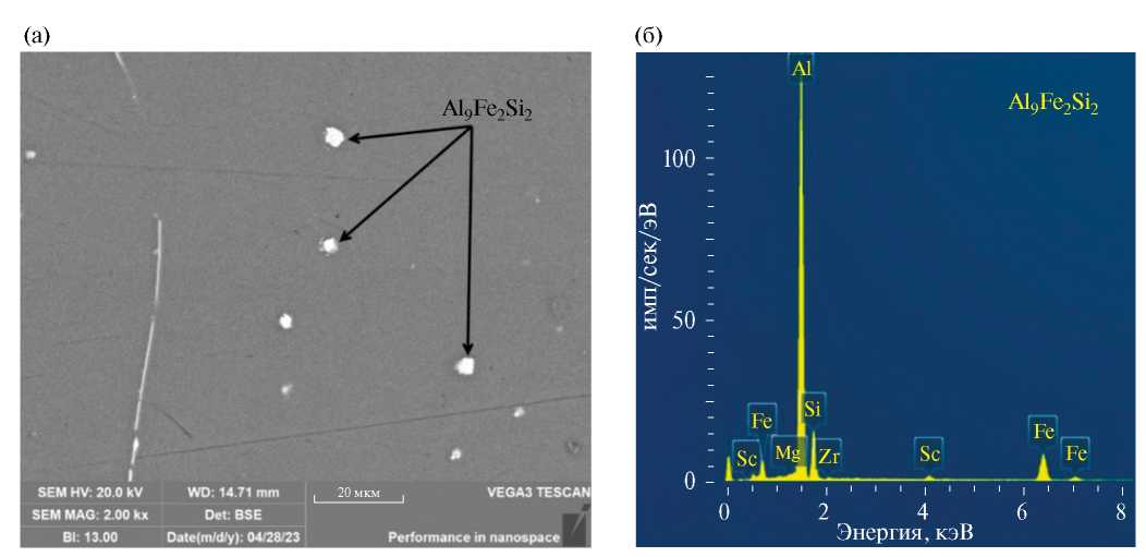 Рис. 7. Результаты СЭМ-исследований сплава AlMgSiScZr после многоступенчатого отжига: 550 °C, 8 ч + 440 °C, 8 ч + 500 °C, 0.5 ч: а –изображение микроструктуры, полученное в обратно рассеянных электронах; б – EDS-анализ обнаруженных частиц (энергодисперсионная рентгеновская спектрограмма).