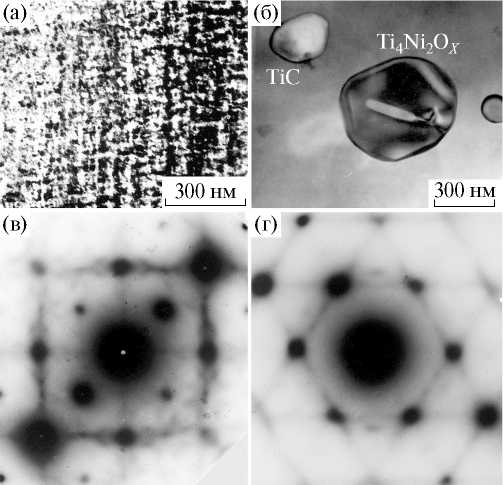 Рис. 3. Светло- (a, в) и темнопольное (г) – в матричном рефлексе 110B2 на микроэлектронограмме 3б, ПЭМ-изображения микроструктуры и соответствующая микроэлектронограмма (б, о. з. [001]B2) сплава Ti49Ni51 после ПИО при 573 К в течение 1 ч.