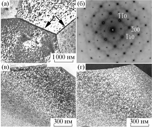 Рис. 6. Светлопольные (a–в) ПЭМ-изображения микроструктуры и соответствующая микроэлектронограмма (г, о. з. [120]B2) сплава Ti49Ni51 после ПИО при 773 К в течение 1 ч.