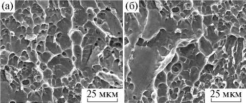 Рис. 9. Фрактография сплава Ti49Ni51 после закалки от 1173 К (а) и ПИО при 673 К, 1 ч (б).
