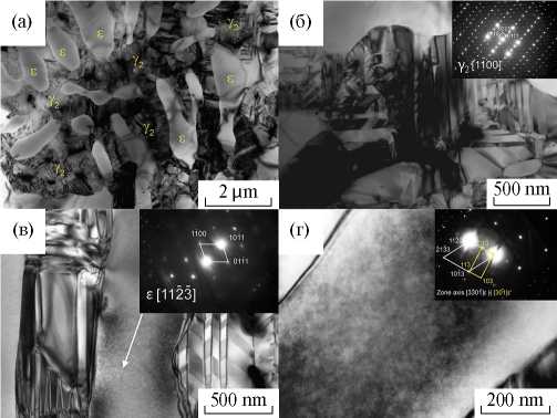Рис. 2. Микроструктура быстрозакалённой ленты (линейная скорость колеса 10 м/с): а) общий вид; б) область γ2-фазы; в) область ε-фазы; г) область ε-фазы с заметным “крапчатым” контрастом от ε’-фазы. Для каждой из областей на вставках приведены соответствующие электронограммы.