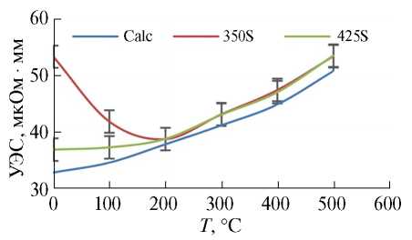 Удельное электросопротивление (УЭС) рассчитывали как величину, обратную удельной электропроводности (УЭП), которую определяли экспериментально на образцах сплава 4Cu3Mn методом вихревых токов на приборе ВЭ-26НП, используя в качестве эталона при каждом измерении чистый алюминий (А99).