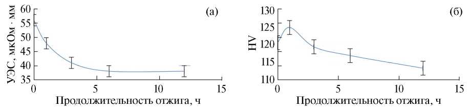 Расчетные и экспериментальные зависимости УЭС имеют хорошее совпадения начиная с 400 °C (рис. 6). При более низких температурах экспериментальные значения выше расчетных, особенно у ленты, полученной по режиму 350S. Это можно объяснить тем, что при таких температурах 3-часовая выдержка недостаточна для достижения равновесия. С другой стороны, отжиг при 350 °C предполагает достижение меньших значений УЭС, чем отжиг при 425 °C, из-за меньших равновесных растворимостей Mn и Cu в (Al) (табл. 3). Для подтверждения этого предположения была построена зависимость величины УЭС для ленты, полученной по режиму 350S, от времени отжига при 350 °C. Уже после 6-часовой выдержки значение снижается до 38 мкОм·мм (т. е. на 3 мкОм · мм меньше, чем после 3-часовой выдержки) (рис. 7). При этом твердость снижается незначительно, оставаясь на уровне ~110 HV. Для сравнения у сплава Al–3.3 %Cu–2.5 %Mn–0.5 %Zr даже после 48-часового отжига при 350 °C, когда твердость находится на таком же уровне, значение УЭС заметно больше (около 40 мкОм·мм) [24]. Из этого следует, что оптимизацией параметров деформационно-термической обработки сплава системы Al–Cu–Mn, содержащего около 3 %Mn, можно добиться наилучшего комплекса свойств, которые требуются для проводниковых материалов, работающих при повышенных температурах.
