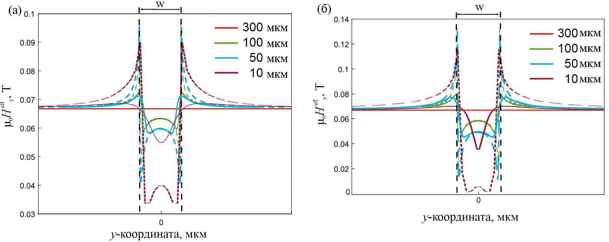 Таким образом, характер распределения внутренних статических полей в исследуемых структурах существенно зависит от ширины волновода w. При уменьшении w и приближении к критической ширине волновода wc ~ 20 мкм распределение поля в форме “вала” сменяется на распределение в форме “долины”. Обобщая полученные результаты, можно утверждать, что при d2 ≈ d1 и фиксированном w критическим значением является величина , зависящая в свою очередь от соотношения намагниченностей насыщения подложки и волновода. Такие особенности трансформации внутреннего магнитного поля исследуемых структур в зависимости от ширины волновода отражаются и на спектре спин-волновых возбуждений, представляющих собой аналог гребенчатого волновода в интегрально оптических структурах. По сравнению с экспериментально и численно исследованной структурой гребенчатого волновода на основе пленки пермаллоя [23], в рассматриваемой структуре на основе двух слоев ЖИГ появляется возможность трансформации статических внутренних магнитных полей путем изменения намагниченности одного из слоев. В то же время двуслойные магнитные пленки можно использовать для создания меандровых волноводов для фильтрации спин-волновых сигналов [24]. При этом преимуществом гребенчатых двуслойных ЖИГ микроволноводов будет являться наличие двух разделенных рабочих диапазонов частот СВ [25]. Далее будут рассмотрены спектры СВ в таких структурах. При этом отдельное внимание будет уделено спектрам ширинных мод [26, 27].