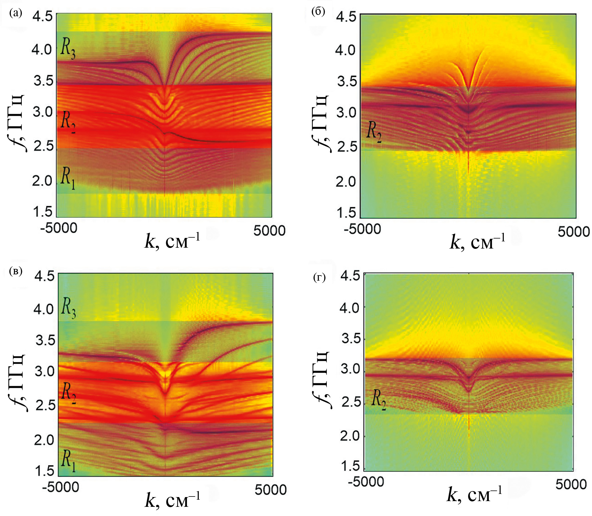 Рассмотрим трансформацию спектров спиновых волн в соответствующих регионах при уменьшении ширины волновода w. Положение и частотная ширина региона R2 остаются практически неизменными, так как они определяются только величиной внутренних магнитных полей в боковых волноводах. Из решения статической задачи следует, что эти поля практически не зависят от ширины w. В случае центрального волновода при уменьшении ширины w его внутренние поля уменьшаются, регионы R1 и R3 сдвигаются вниз по частоте, при этом частотная ширина региона R3 уменьшается, а R1 увеличивается (рис. 5a, в). Спектр ширинных мод становится более разряженным и возможна реализация квази-одномодового одноволнового режима распространения в центральном волноводе, например, на частоте f = 3.5 ГГц и выше (рис. 5в).