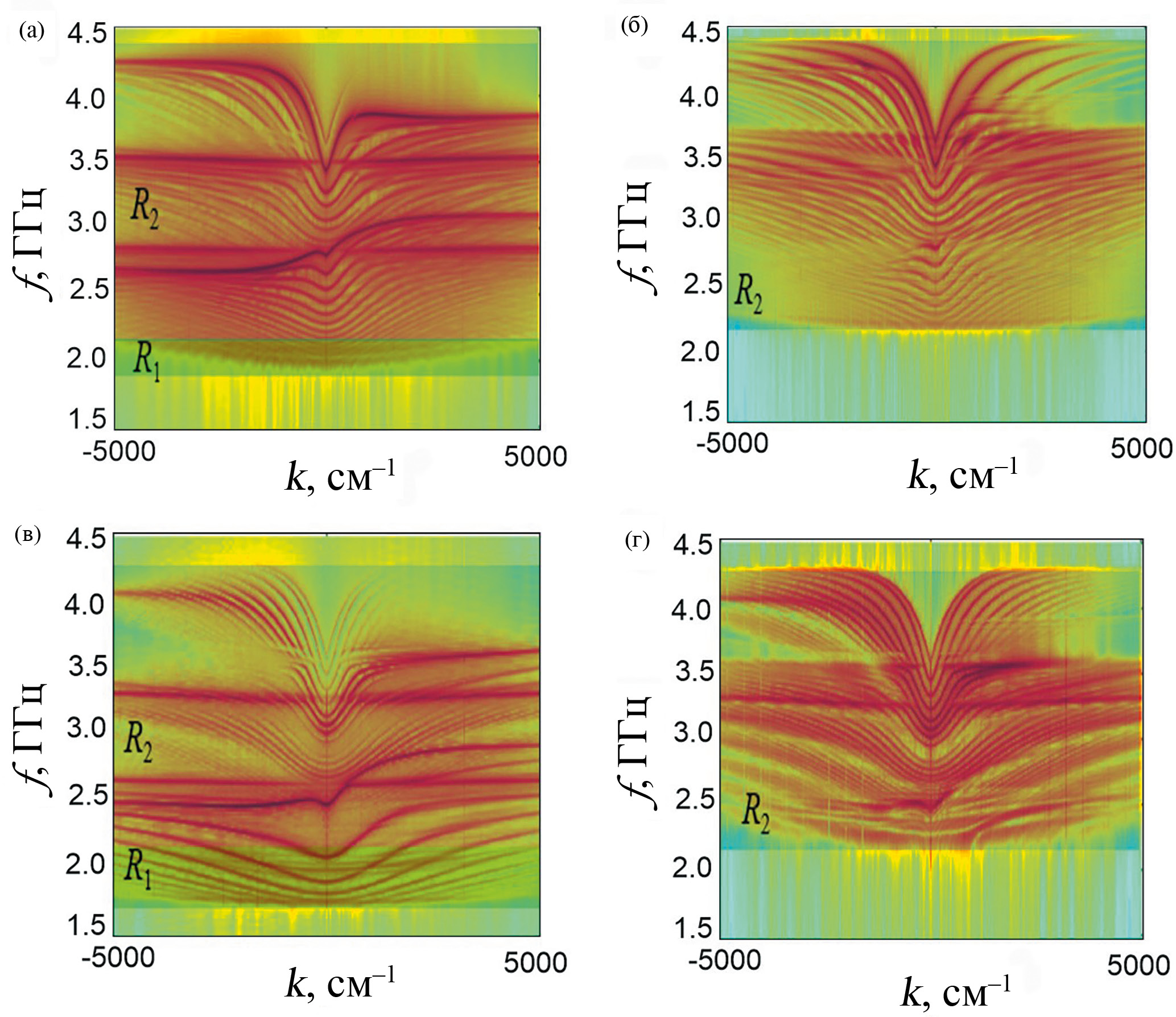 К региону R2 в низкочастотной области примыкает регион R1, в котором моды центрального волновода являются направляемыми (рис. 6a, в). При уменьшении ширины волновода частотный диапазон региона R1 увеличивается и его нижняя граница смещается в область более низких частот. При этом до значений wc ~ 20 мкм направляемыми модами центрального волновода являются только объемные моды спиновых волн с взаимным характером распространения (рис. 6а, б).