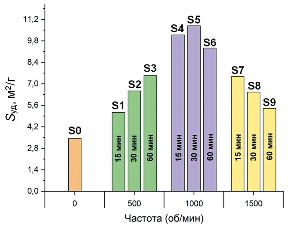 Таким образом, по данным БЭТ-анализа наименьший размер частиц (соответствующий наибольшей площади удельной поверхности) удалось получить при измельчении на 1000 об/мин в течение 30 мин.