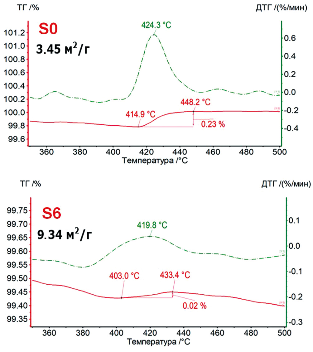 Выявление термической аномалии перехода ферримагнетик–парамагнетик было затруднено в высокодисперсных образцах из-за сторонних процессов, перекрывающих весовую ступень перехода. В качестве сравнения на рис. 9 представлены термограммы образцов S0 и S6, сильно различающихся по площади удельной поверхности.