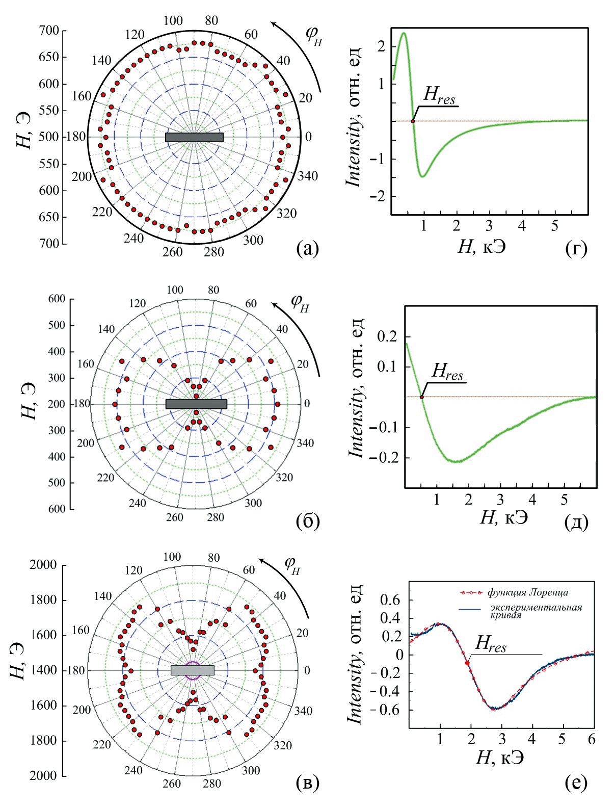 Рис. 6. Угловые зависимости резонансных полей покрытий на основе сплавов Fe/С (а, г), Co/С (б, д) и Ni/С (в, е) и примеры спектров при φH = 0°