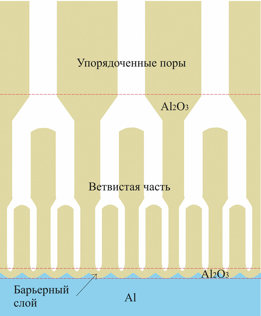 Далее выполняли анодирование пленок при комнатной температуре в водном растворе щавелевой кислоты (3М). При этом положительным электродом служила пленка Al, в качестве отрицательного электрода выступала платиновая сетка. Напряжение составляло 40 В, время основного этапа анодирования – 4 минуты. На заключительном этапе анодирования производили ступенчатое снижения тока, а затем напряжения для получения дендритной структуры и истончения барьерного слоя, который образуется в районе границы с металлическим алюминием. Схематическое изображение барьерного слоя и вида самой структуры показано на рис. 1.