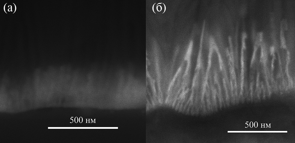 Изображения сколов массивов нанопроволок Ni, осажденных в режимах постоянного и переменного токов, представлены на рис. 2. Исходя из методики получения изображений, более светлые структуры соответствуют нанопроволокам Ni, которые окружены темной матрицей оксида алюминия. Стоит отметить, что рост нанопроволок начинается с области наибольшего ветвления, так как в силу специфики процесса изготовления матриц оксида алюминия именно там располагается наиболее тонкий барьерный слой.
