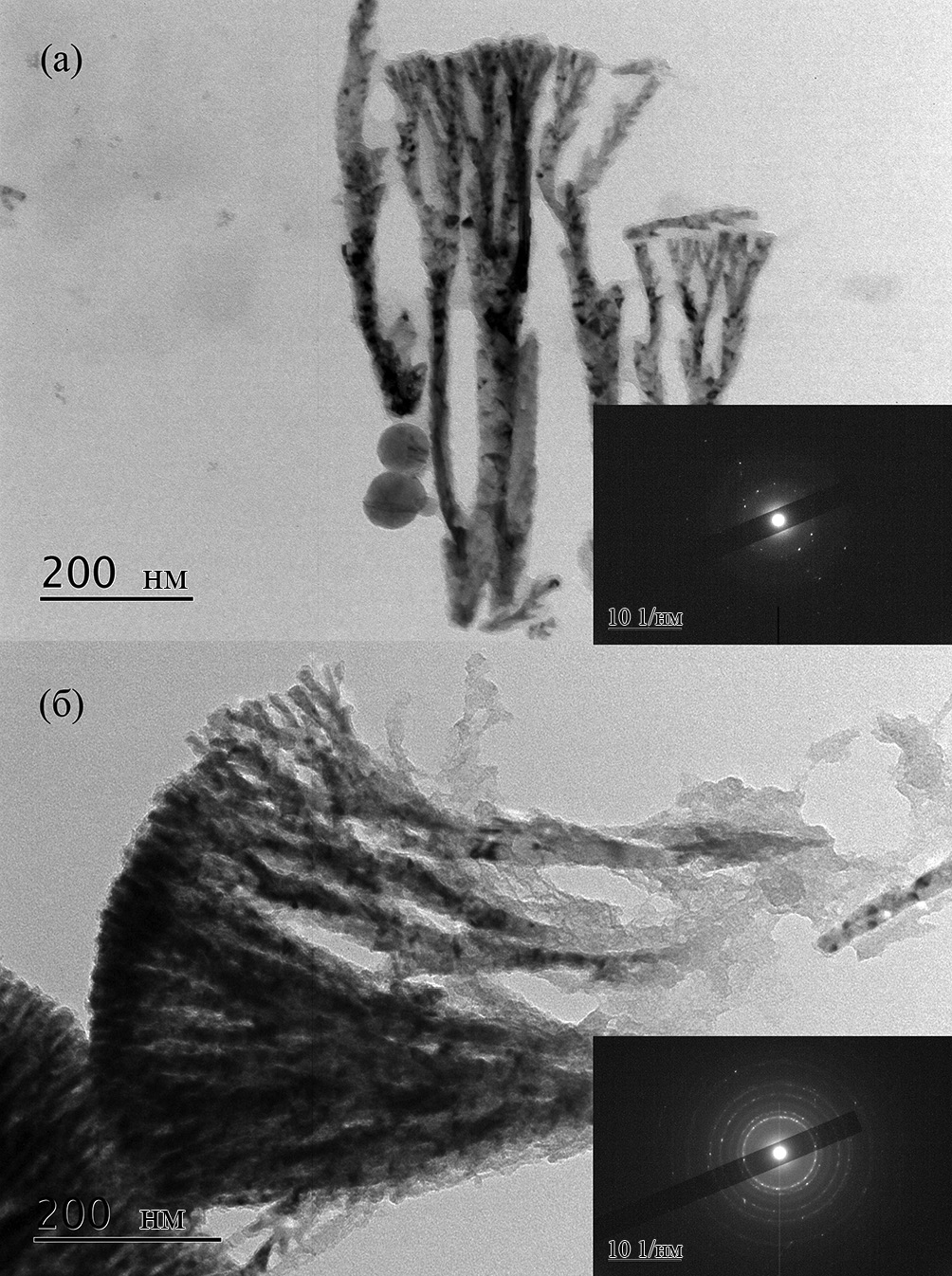 Рис. 3. Изображение, полученное методом просвечивающей электронной микроскопии, нанопроволок Ni, осажденных в режиме постоянного (а) и переменного (б) тока. На вставках приведены соответствующие дифрактограммы