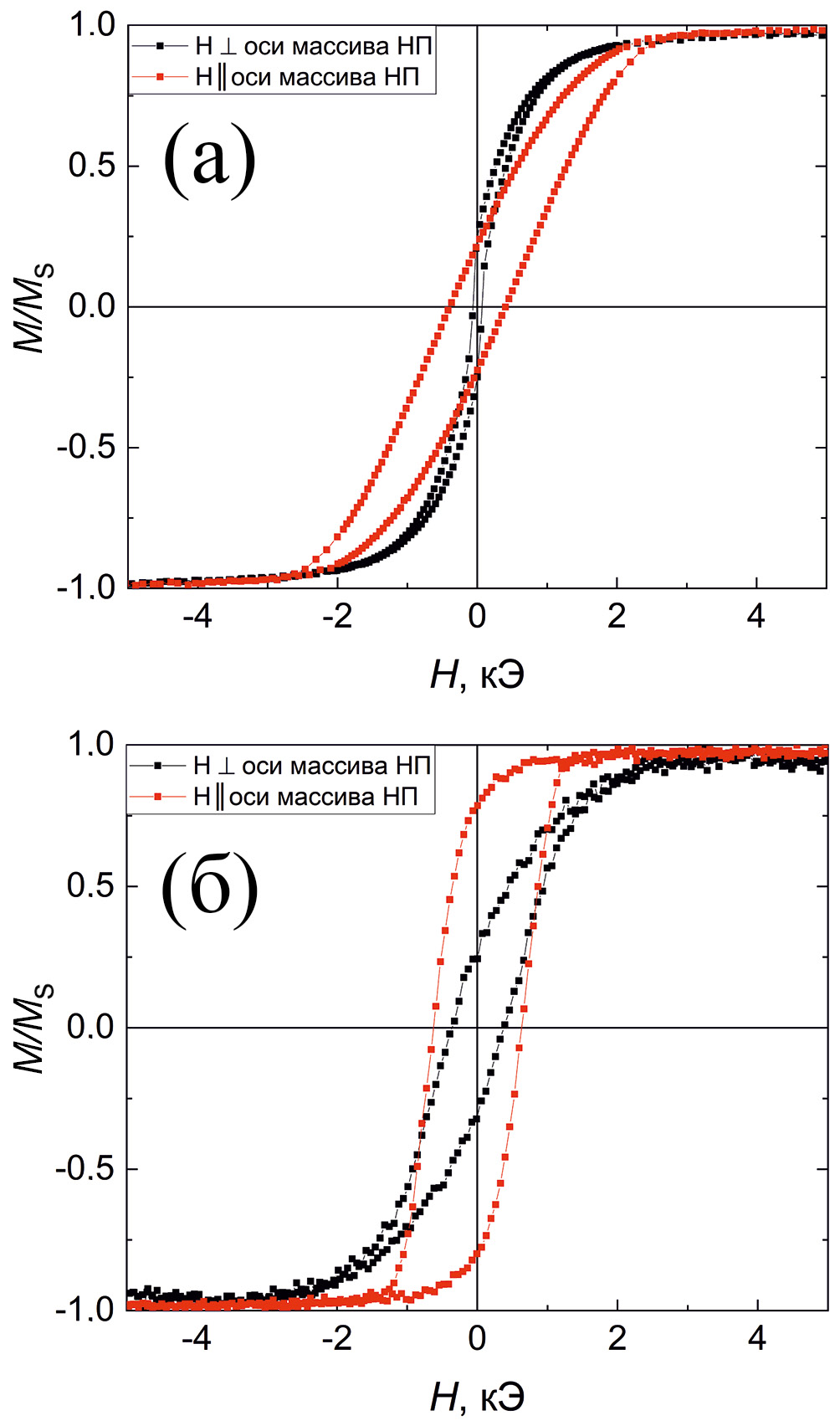 Рис. 4. Петли гистерезиса, полученные для образцов с массивами нанопроволок Ni, осажденными в режиме постоянного (а) и переменного (б) тока, измеренные параллельно (красная) и перпендикулярно (черная) оси массива нанопроволок