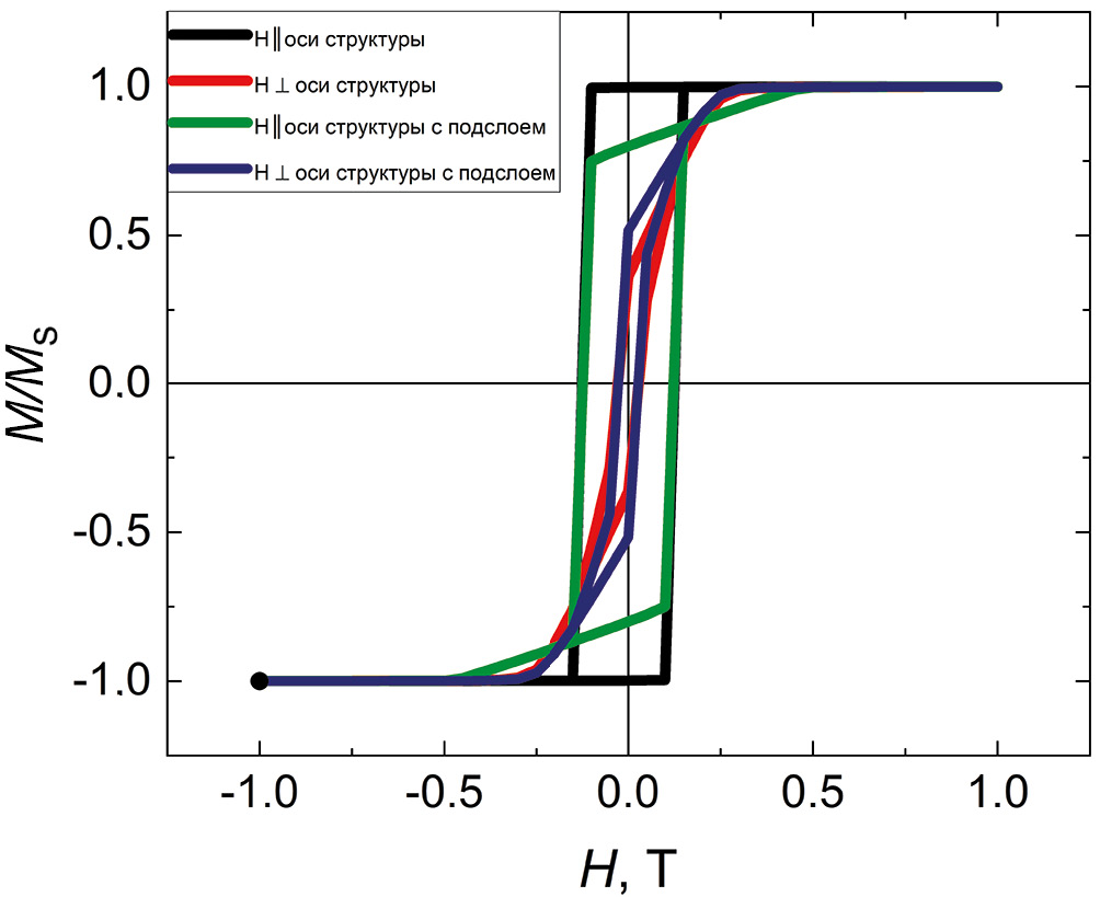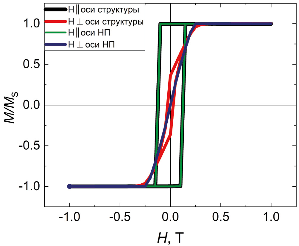 Исследование магнитных свойств проводили на вибрационном магнитометре LakeShore 7407 при комнатной температуре в диапазоне полей ±10 кЭ, направленных вдоль и перпендикулярно оси массивов нанопроволок, на образцах размером 3×4 мм. Для интерпретации полученных результатов с помощью микромагнитного моделирования использовали программный пакет Ubermag [32].