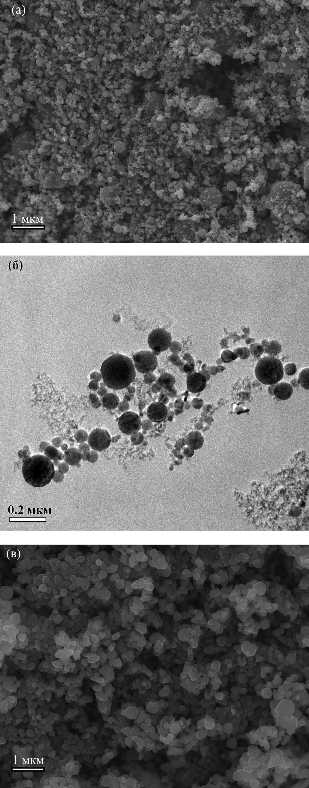 Рис. 1. Изображения ЭВП МНЧ исследуемой партии: РЭМ – (а) и ТЭМ – (б); РЭМ – (в) изображение коммерческих микрочастиц Alfa Aesar, исследованных для сравнения с ЭВП МНП