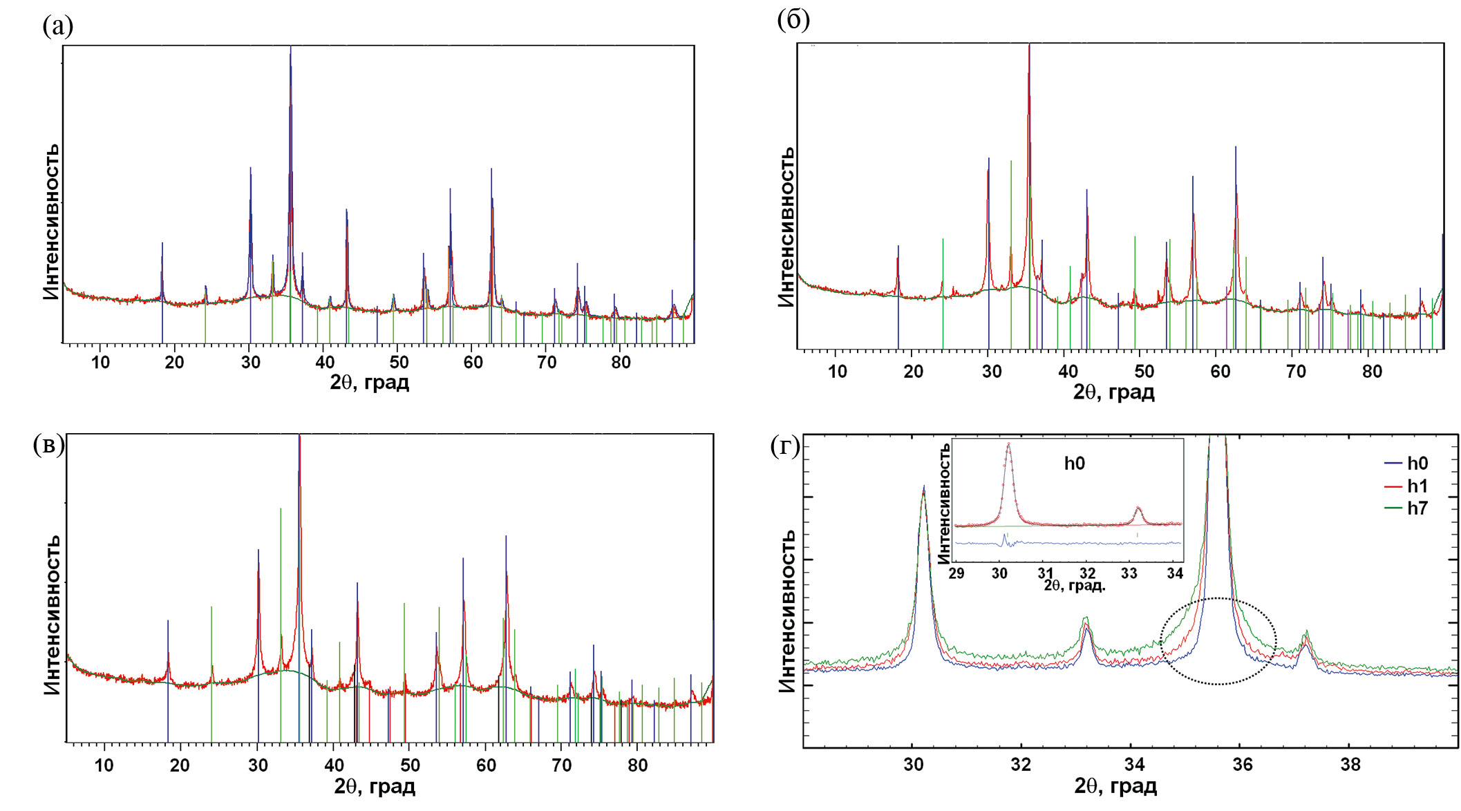 Рис. 2. РФА ЭВП наночастиц оксидов железа. а – h0, исходное состояние; пики магнетита Fe3O4 и маггемита Fe2O3 отмечены вертикальными синими и зелеными линиями; б – h1, состояние после 1 часа механической обработки; пики Fe3O4, γ-Fe2O3, FeO и Fe отмечены вертикальными синими, зелеными, красными и лиловыми линиями соответственно; в – h7 состояние после 7 ч обработки; пики Fe3O4, γ-Fe2O3 и FeO отмечены вертикальными синими, зелеными, лиловыми линиями b черными линиями; г – РФА-данные для МНЧ h0, h1и h7 в интервале углов вблизи самого интенсивного пика (311), часть 2θ ≈ 35.45° показана пунктирным овалом. На вставке – пример подгонки самых интенсивных пиков для ЭВП МНЧ h0, позволяющих определить средний размер области когерентного рассеяния для Fe3O4 и γ-Fe2O3 фаз