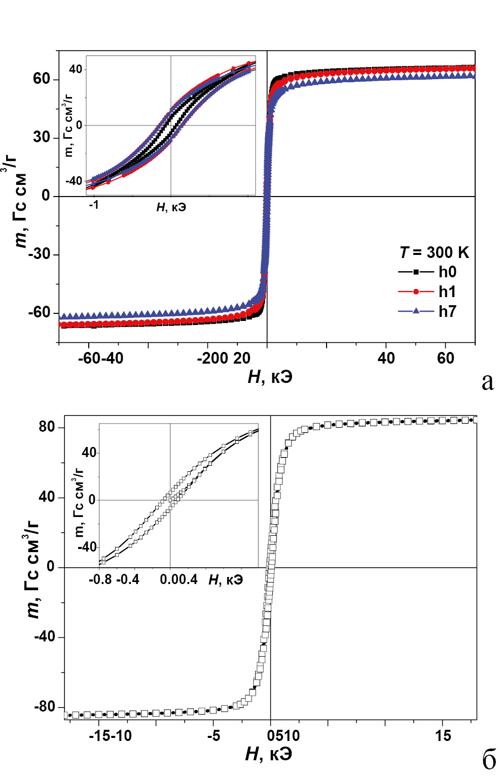 Рис. 3. Петли магнитного гистерезиса образцов h0, h1, h7 (а), коммерческого образца АА (б). На вставках – более подробно в области малых магнитных полей