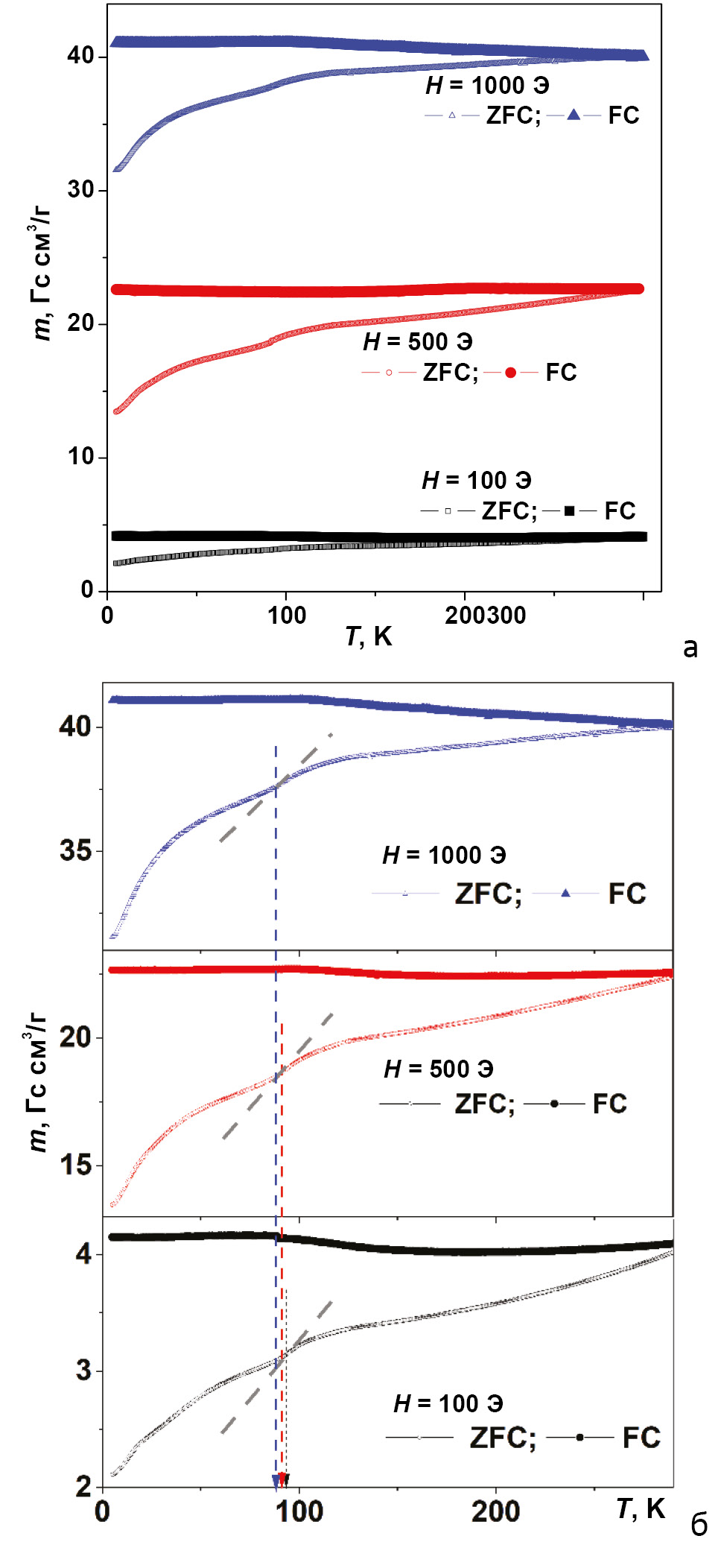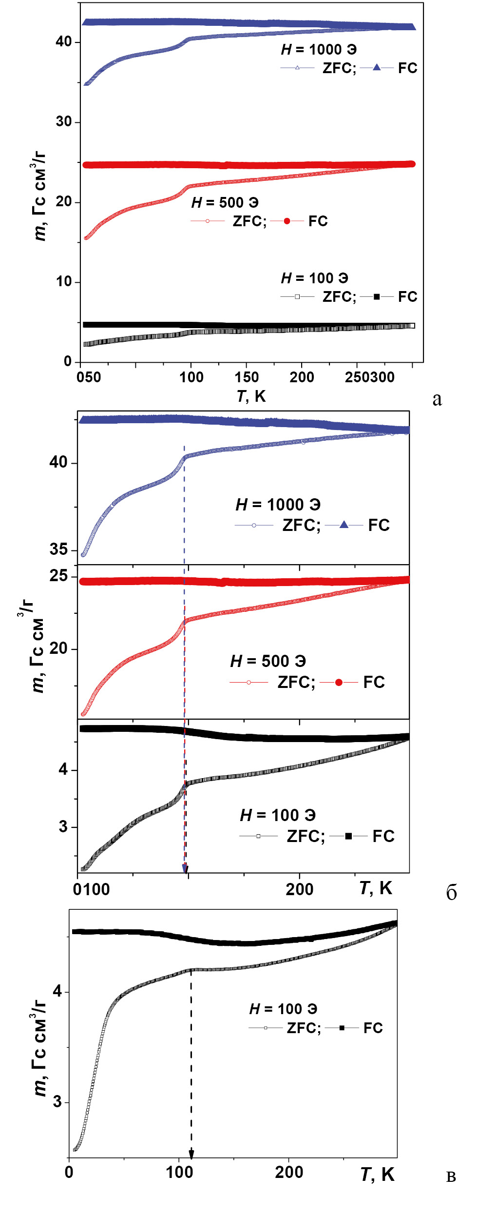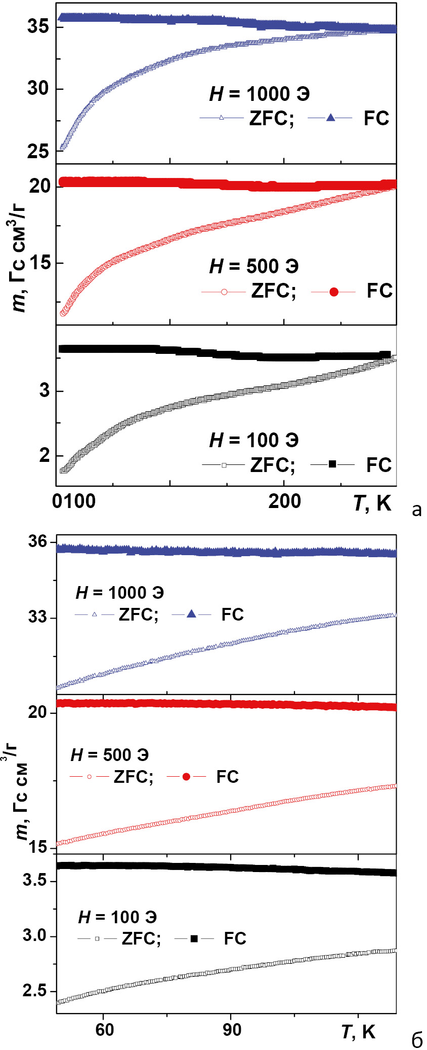 При увеличении магнитного поля при измерениях кривых ZFC–FC удельный магнитный момент образца также увеличивается. При анализе всех кривых, построенных в одном масштабе, области перехода Вервея хорошо видны для полей в 500 и 1000 Э (рис. 4а), но при перестроении в другом масштабе (рис. 4б) не вызывает сомнений, что даже в поле 100 Э переход Вервея отчетливо наблюдается примерно при той же температуре (~97 К), что и при 500 и 1000 Э. Отметим, что в случае магнетита АА с более крупным размером частиц (рис. 4б) переход Вервея наблюдается при несколько более высокой температуре около 100 К, и сам переход размыт вследствие высокой дефектности АА микрочастиц и вариабельности их размеров.